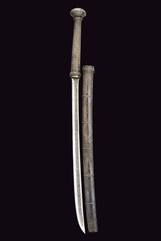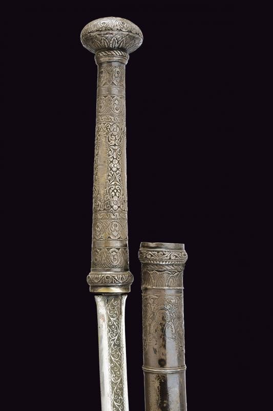 Lama leggermente curva a un filo, decorata su entrambi i lati e su tutta la lunghezza (parzialmente anche al dorso) a volute su fondo scuro. Impugnatura e fodero in legno rivestito in lamina di argento riccamente inciso a motivi floreali. Il fodero con alcune mancanze e una dedica di epoca successiva. Questo lotto è importato da un Paese extra UE e comporta una tassazione aggiuntiva rispetto alla commissione della casa d'aste e alla tassa sul servizio. Di conseguenza, la commissione totale, comprensiva di tutte le tasse, ammonta al 35%.