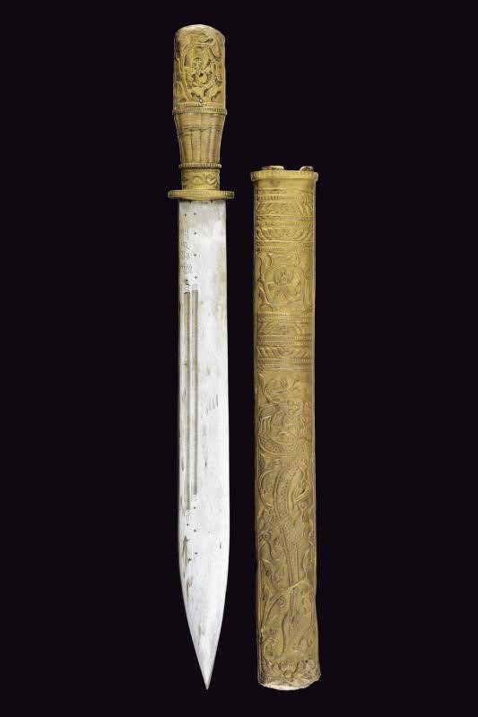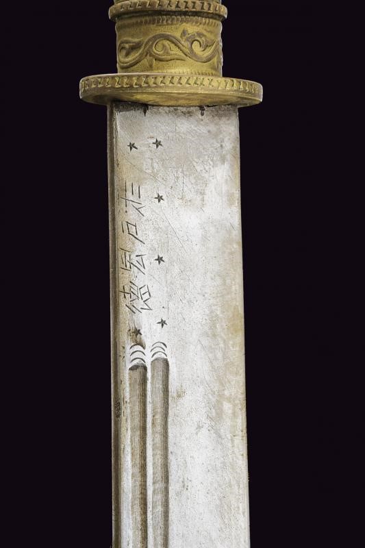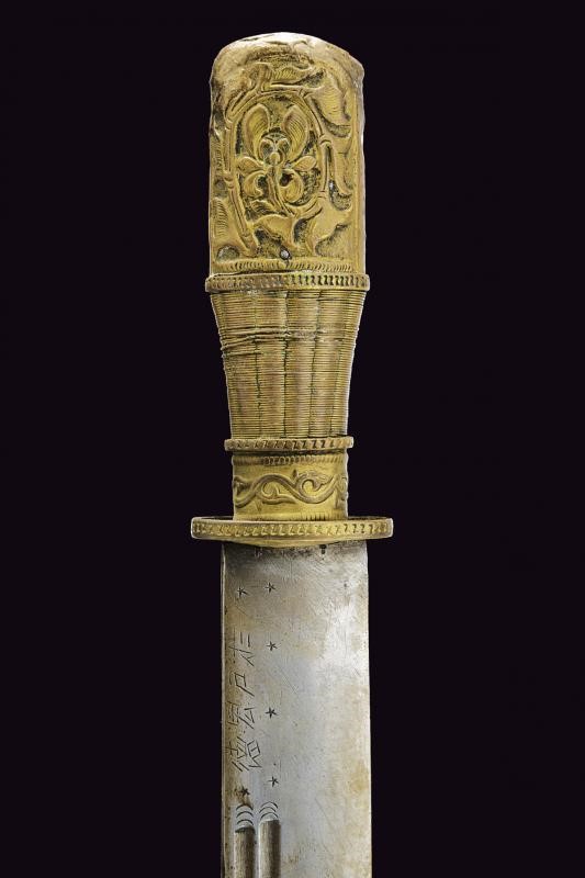 Robusta lama a un filo, duplice scanalatura e iscrizioni in caratteri asiatici. Impugnatura e fodero rivestiti in lamina di ottone sbalzato con drago e a motivi floreali. Attacchi in cuoio. Questo lotto è importato da un Paese extra UE e comporta una tassazione aggiuntiva rispetto alla commissione della casa d'aste e alla tassa sul servizio. Di conseguenza, la commissione totale, comprensiva di tutte le tasse, ammonta al 35%.