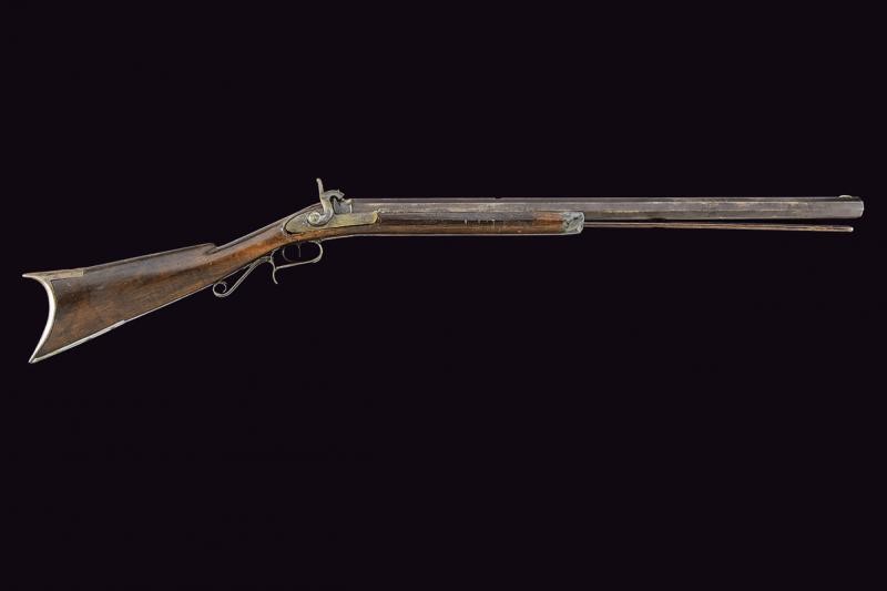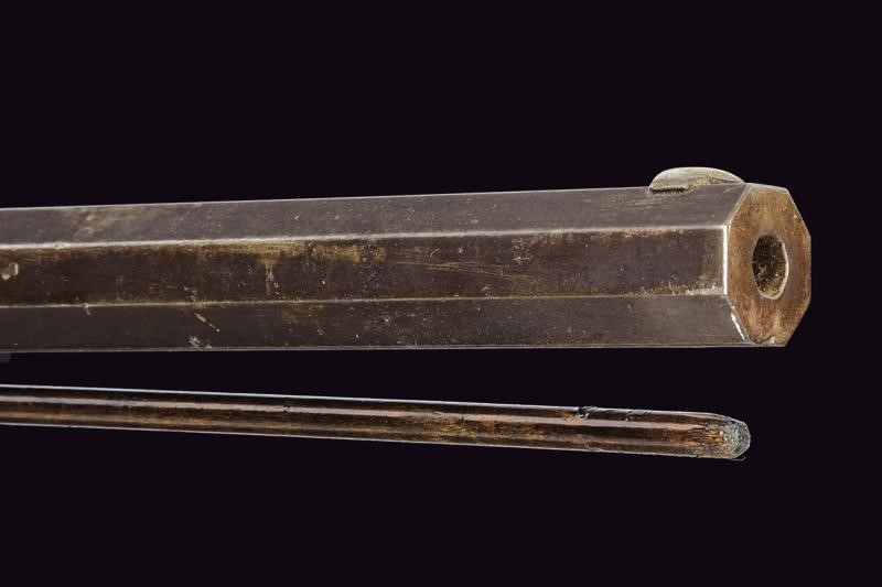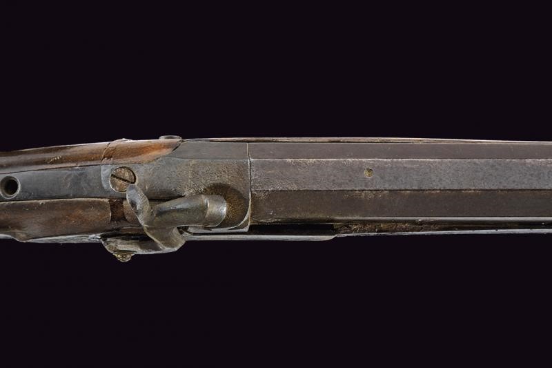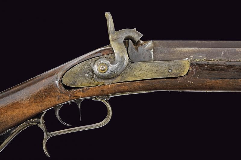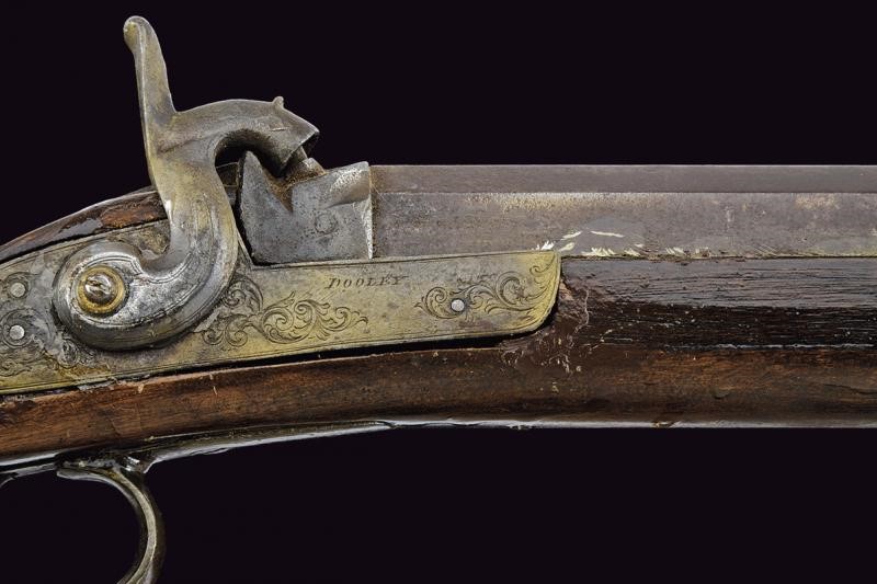 Pesante canna rigata, ottagonale, alzo mancante, mirino in ottone, cal. 11 mm. Codetta con foro per una diottra. Batteria a molla in avanti firmata "DOOLEY" ed incisa a motivi floreali. Meccanica non funzionante. Mezza cassa in legno con restauri nella prima parte. Fornimenti in ferro. Danni e restauri. Bacchetta probabilmente non pertinente. Questo lotto è importato da un Paese extra UE e comporta una tassazione aggiuntiva rispetto alla commissione della casa d'aste e alla tassa sul servizio. Di conseguenza, la commissione totale, comprensiva di tutte le tasse, ammonta al 35%.