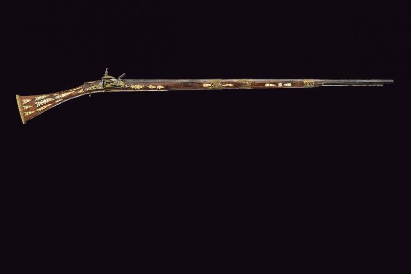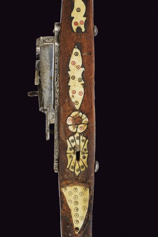 Lunga canna liscia, ottagonale, alzo in ottone alla base, su tutta la lunghezza decorata a motivi geometrici in argento. Codetta rivestita in ottone (la vite mancante). Bella batteria alla micheletta con rivestimenti in ottone inciso a volute (piccole mancanze). Cassa in legno decorata con placche in osso dipinte con cerchi rossi e neri. Grilletto a turbante. Bacchetta in ferro. Questo lotto è importato da un Paese extra UE e comporta una tassazione aggiuntiva rispetto alla commissione della casa d'aste e alla tassa sul servizio. Di conseguenza, la commissione totale, comprensiva di tutte le tasse, ammonta al 35%.