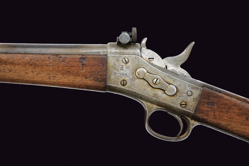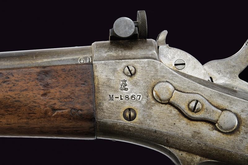 Canna tonda, rigata (anima pulita, rigatura ben visibile), nella prima parte si trovano dei fori parzialmente riempiti di vecchi mirini; mirino professionale da gara, cal. 11 mm. Castello marcato "M-1867" e con punzone, la codetta "KJOBENHAVNS TOIHUUS 1882"; davanti al tipico otturatore con estrattore automatico, si trova una diottra di precisione. Calcio ed astina in legno. Fornimenti in ferro. Bacchetta mancante. Meccanica funzionate. Questo lotto è importato da un Paese extra UE e comporta una tassazione aggiuntiva rispetto alla commissione della casa d'aste e alla tassa sul servizio. Di conseguenza, la commissione totale, comprensiva di tutte le tasse, ammonta al 35%.