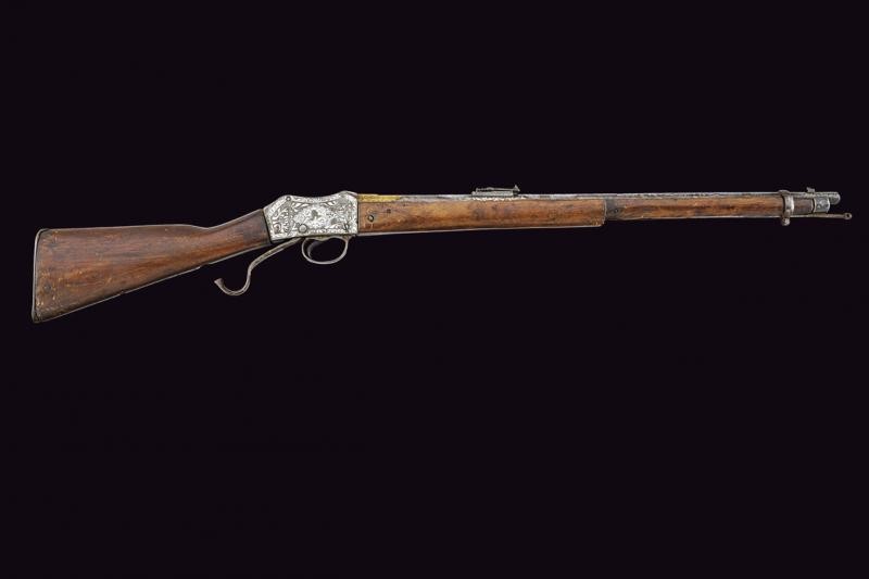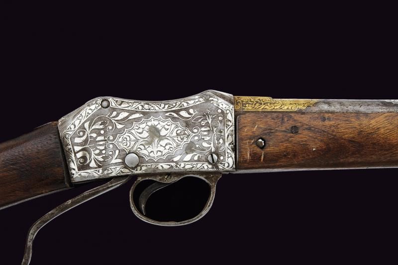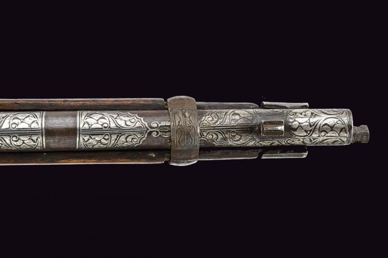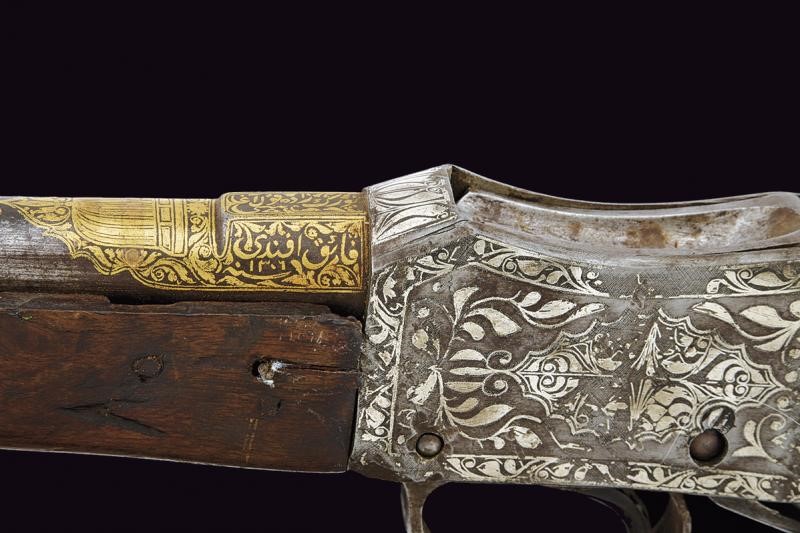 Interessante canna tonda, rigata (rigatura appena visibile), la base con breve bindella decorata in oro con iscrizioni in arabo e motivi floreali, il resto della canna decorata in argento; alzo variabile e mirino, cal. 11 mm. Castello in ferro decorato in argento a motivi floreali. Calcio ed astina in legno di semplice fattura. Il bocchino con fascia in argento inciso e niellato. Bacchetta in ferro. Difetti e mancanze. Meccanica da rivedere. Questo lotto è importato da un Paese extra UE e comporta una tassazione aggiuntiva rispetto alla commissione della casa d'aste e alla tassa sul servizio. Di conseguenza, la commissione totale, comprensiva di tutte le tasse, ammonta al 35%.