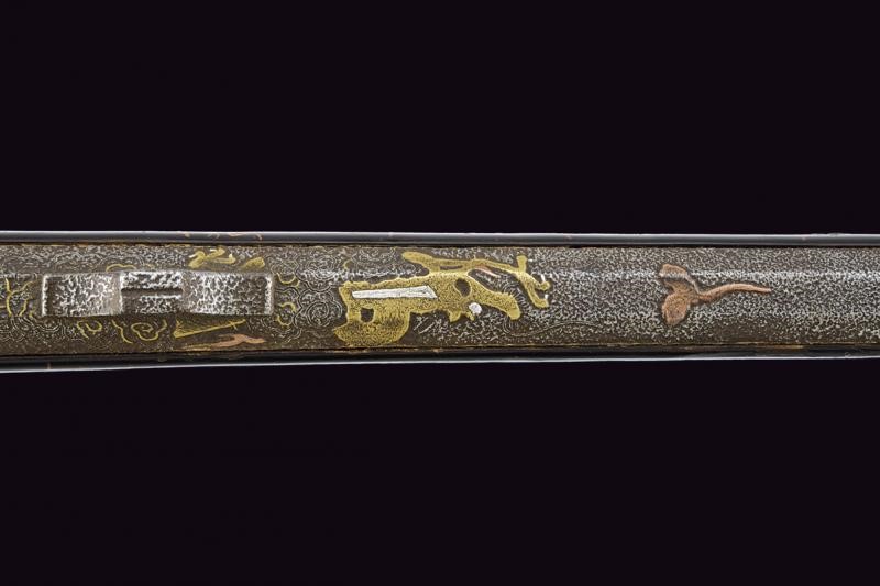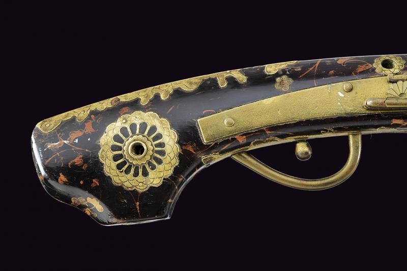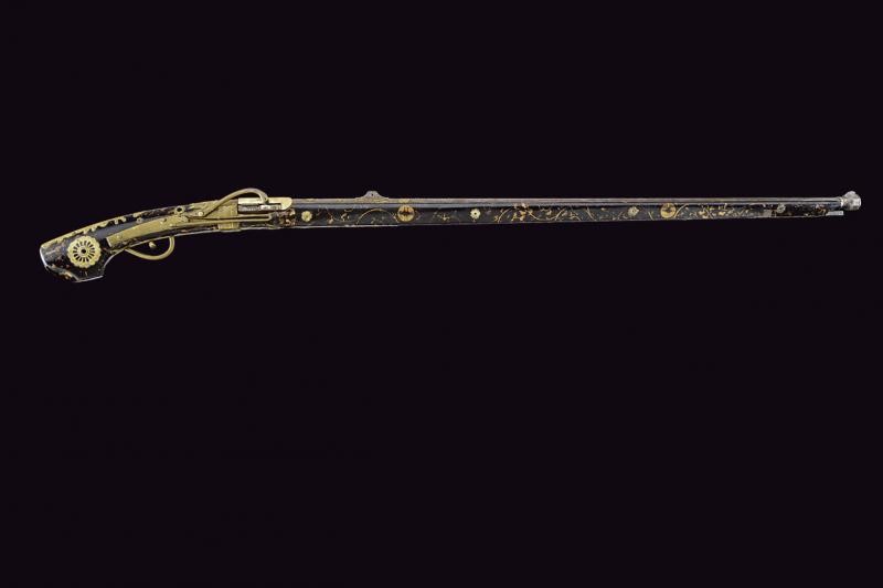 Canna liscia, ottagonale, di sezione decrescente verso la volata, munita di traguardo e mirino, la volata ingrossata e con collo ristretto; la prima parte decorata in oro, argento e ottone; le estremità con cornici in argento; cal. 13 mm. Sul lato destro della canna scodellino (copriscodellino mancante). Batteria in ottone, la molla debole. Cassa intera in legno (piccola mancanza) laccato di nero e dipinto in oro a motivi floreali e con fornimenti in ottone inciso e parzialmente traforato. Sotto la canna due volatili in metalli differenti. Piccoli difetti. Bacchetta in ferro. Raro. Questo lotto è importato da un Paese extra UE e comporta una tassazione aggiuntiva rispetto alla commissione della casa d'aste e alla tassa sul servizio. Di conseguenza, la commissione totale, comprensiva di tutte le tasse, ammonta al 35%.