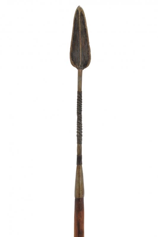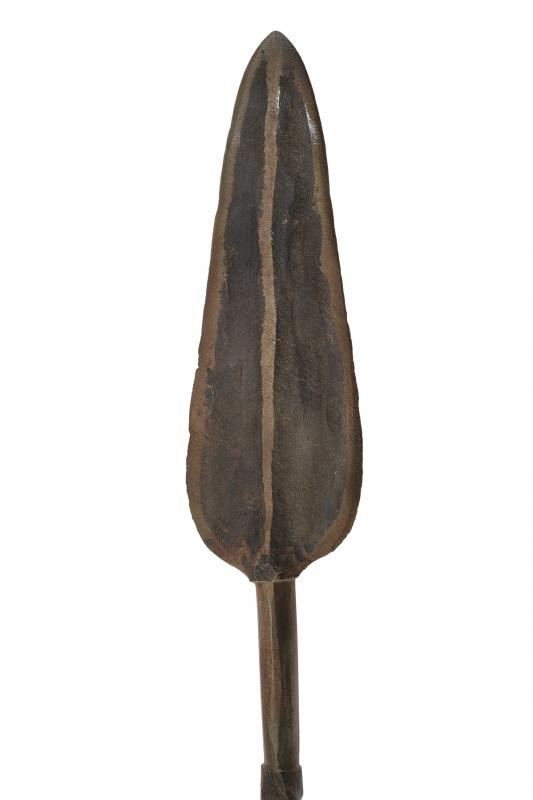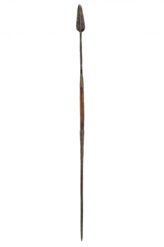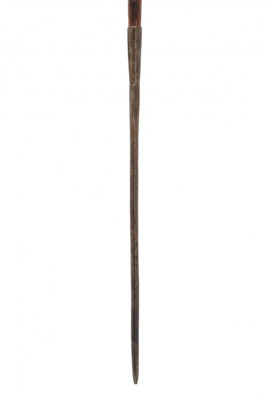 Piccola cuspide a foglia con nervatura centrale; la base lavorata a spire, gorbia troncoconica. La parte centrale in legno, lunga base in ferro. Questo lotto è importato da un Paese extra UE e comporta una tassazione aggiuntiva rispetto alla commissione della casa d'aste e alla tassa sul servizio. Di conseguenza, la commissione totale, comprensiva di tutte le tasse, ammonta al 35%.