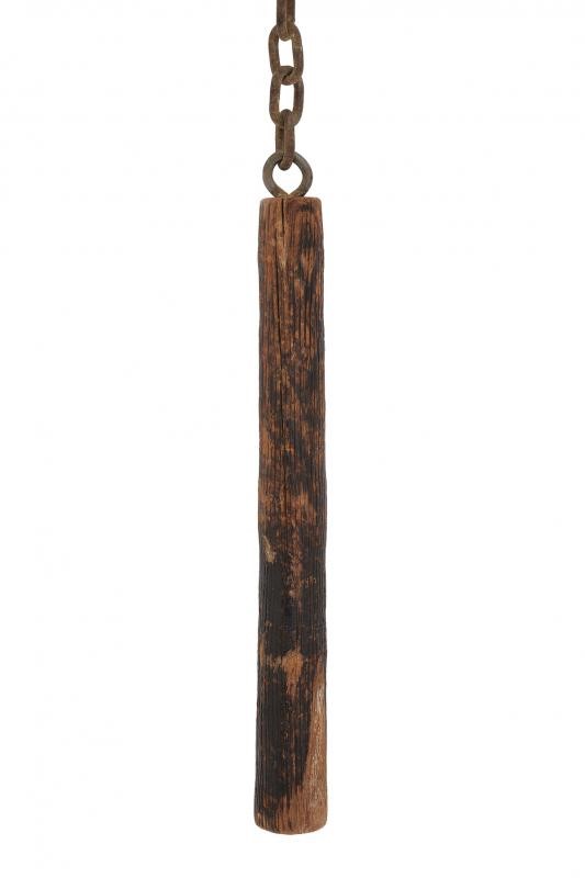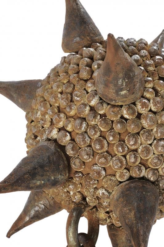 Grande testa sferica in legno, munita di dodici robuste cuspidi appuntite in ferro (un'altra mancante), il resto della superficie tempestata con piccole cuspidi in ferro. Fissata con una catena su un fusto ligneo. Questo lotto è importato da un Paese extra UE e comporta una tassazione aggiuntiva rispetto alla commissione della casa d'aste e alla tassa sul servizio. Di conseguenza, la commissione totale, comprensiva di tutte le tasse, ammonta al 35%.