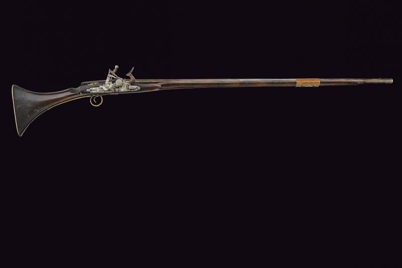 Canna lisci a due ordini, la prima parte ottagonali con finti punzoni ed incisioni; alzo e mirino; cal. 14 mm. Codetta incisa, la vite mancante. Batteria snaphaunce a pietra focaia con marca e decorazioni rimesse in argento. Cassa in legno di tipica forma. Fornimenti in ottone. Piccole mancanze e difetti. Bacchetta mancante. Questo lotto è importato da un Paese extra UE e comporta una tassazione aggiuntiva rispetto alla commissione della casa d'aste e alla tassa sul servizio. Di conseguenza, la commissione totale, comprensiva di tutte le tasse, ammonta al 35%.