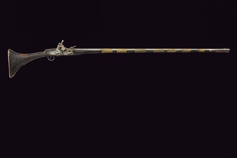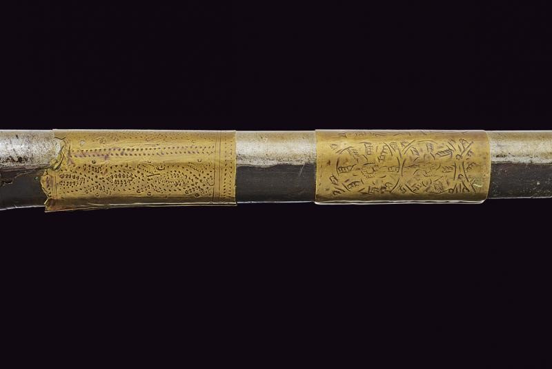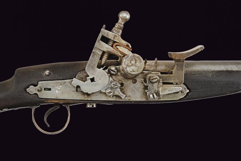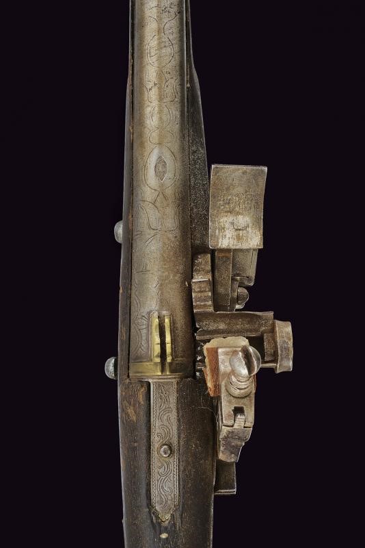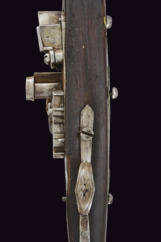 Canna liscia tonda, la base con alzo in ottone, punzone e resti di incisioni; mirino, cal. 16 mm. Codetta incisa. Batteria tipica del tipo snaphaunce. Cassa in legno, difetti e restauri. Fornimenti in ferro e ottone. Bacchetta in legno. Questo lotto è importato da un Paese extra UE e comporta una tassazione aggiuntiva rispetto alla commissione della casa d'aste e alla tassa sul servizio. Di conseguenza, la commissione totale, comprensiva di tutte le tasse, ammonta al 35%.