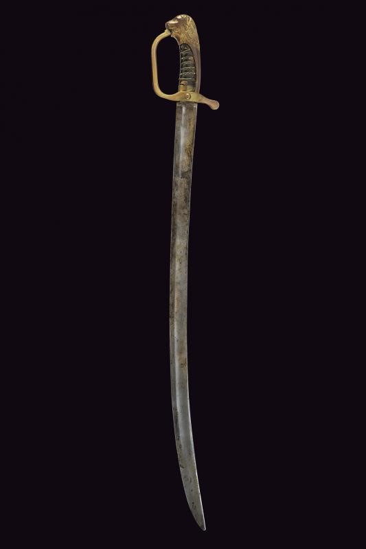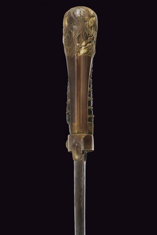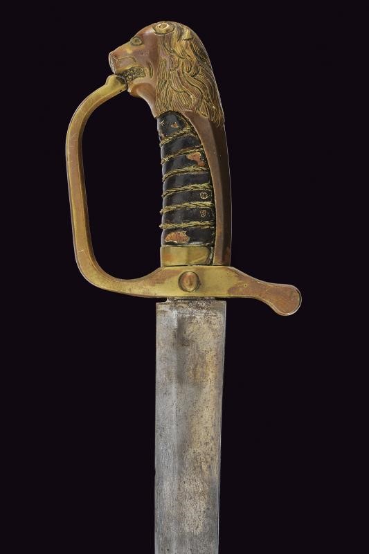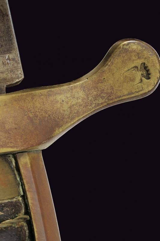 Lama curva a un filo con ampio sguscio, punzone alla base; tallone. Fornimento in bronzo con resti di doratura, ramo di guardia, punzone sul braccio dell'elso con il marchio di un armaiolo danese, un martello e un mazzafrusto incrociati; grande pomo a testa di leone. Impugnatura in legno rivestita in cuoio con trecciola metallica. Rara. Questo lotto è importato da un Paese extra UE e comporta una tassazione aggiuntiva rispetto alla commissione della casa d'aste e alla tassa sul servizio. Di conseguenza, la commissione totale, comprensiva di tutte le tasse, ammonta al 35%.