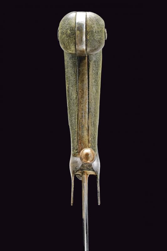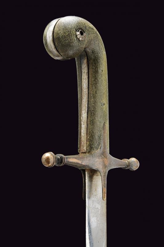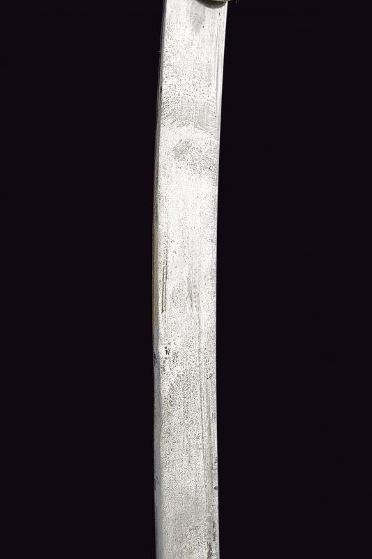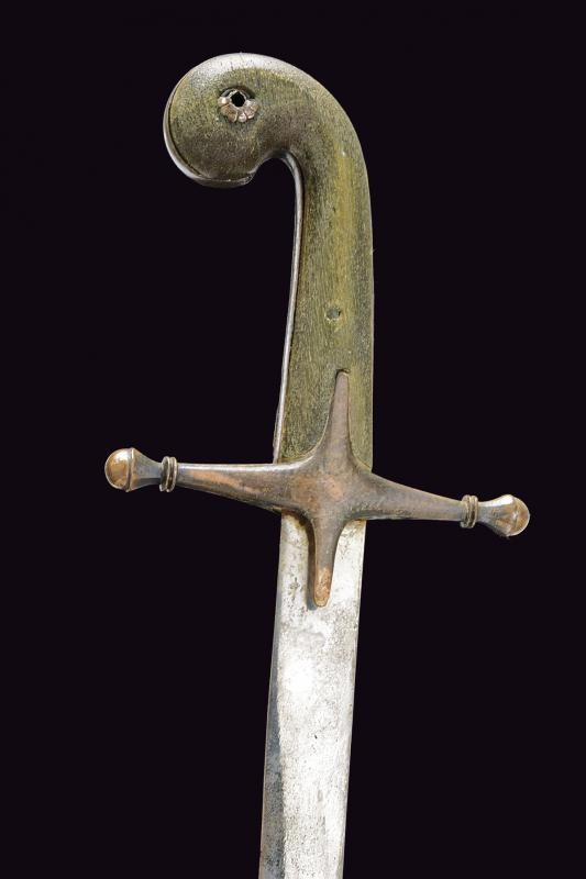 Lama piatta, curva, a un filo. Fornimento a croce in ferro decorato in rame con resti di incisioni; gancetti in legno con pomo angolato. Fodero in legno rivestito in cuoio (piccole mancanze) e cucito in filo metallico; fornimenti in ferro decorati en suite con l'elso, due anelli di sospensione. Questo lotto è importato da un Paese extra UE e comporta una tassazione aggiuntiva rispetto alla commissione della casa d'aste e alla tassa sul servizio. Di conseguenza, la commissione totale, comprensiva di tutte le tasse, ammonta al 35%.