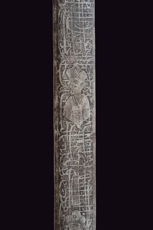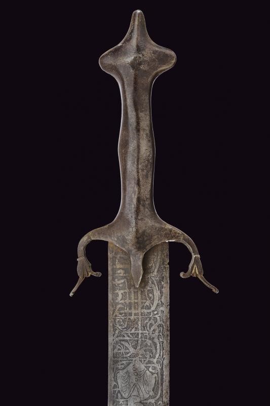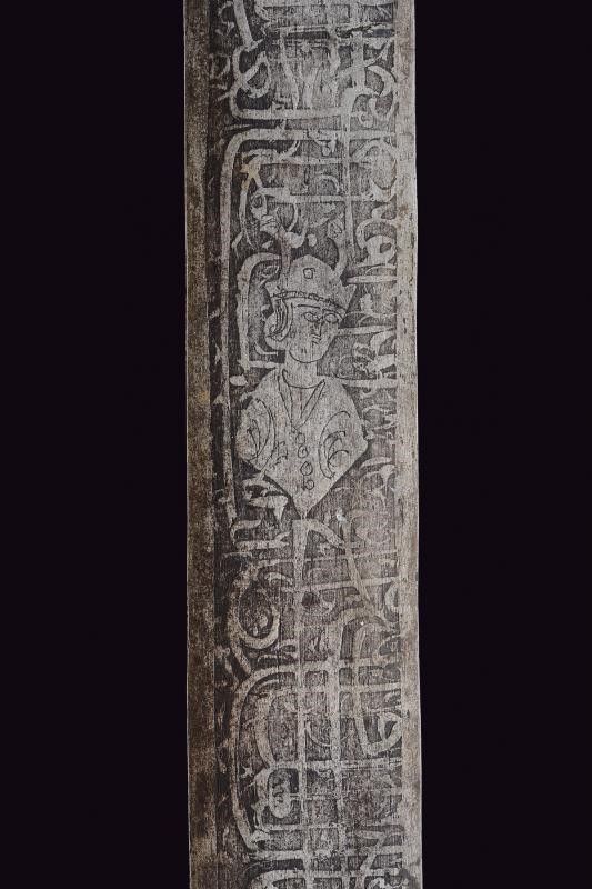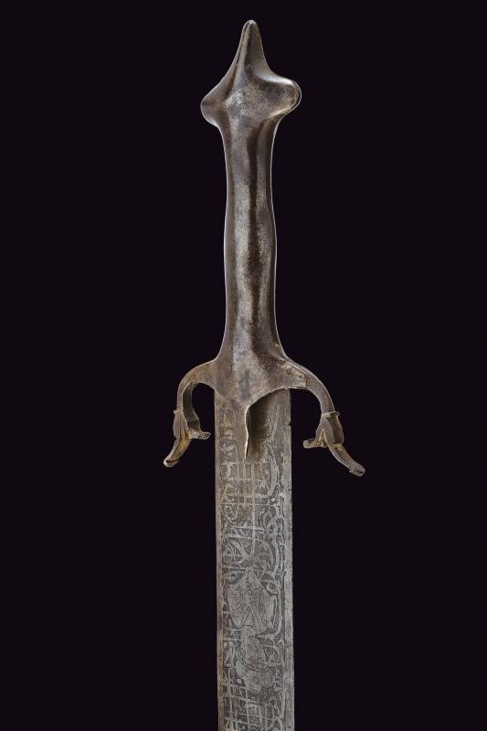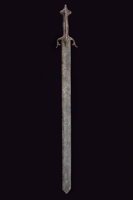 Larga lama dritta a due fili completamente incisa con figure e iscrizioni. Fornimento in ferro. Questo lotto è importato da un Paese extra UE e comporta una tassazione aggiuntiva rispetto alla commissione della casa d'aste e alla tassa sul servizio. Di conseguenza, la commissione totale, comprensiva di tutte le tasse, ammonta al 35%.
