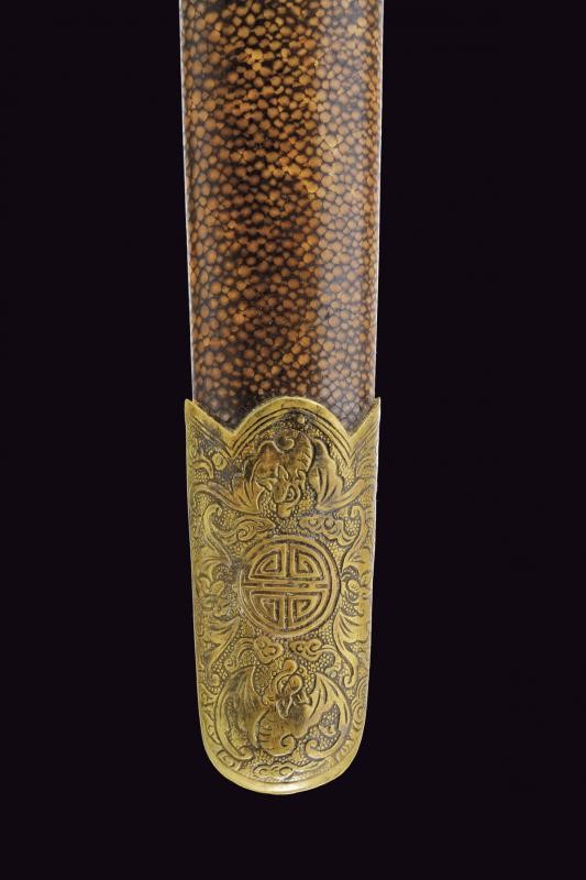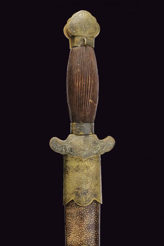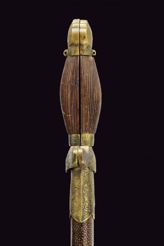 Lame a due fili e costolate; fornimenti in ottone massiccio, masselli e pomi in ottone con simboli e motivi floreali, impugnature in legno marrone decorate a nervature. Insieme in un unico fodero in legno, rivestito con pelle di razza dipinta color marrone, dotato di fornimenti in ottone decorati en suite. Questo lotto è importato da un Paese extra UE e comporta una tassazione aggiuntiva rispetto alla commissione della casa d'aste e alla tassa sul servizio. Di conseguenza, la commissione totale, comprensiva di tutte le tasse, ammonta al 35%.