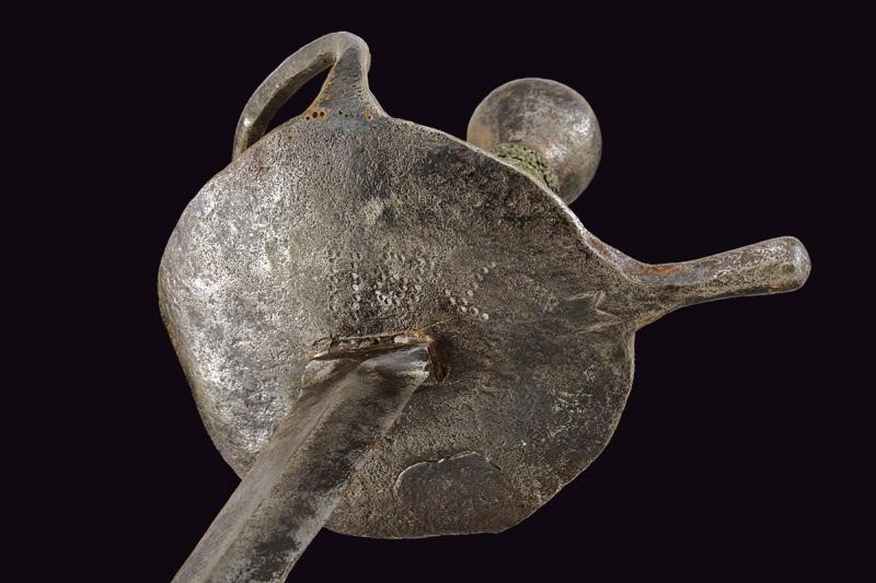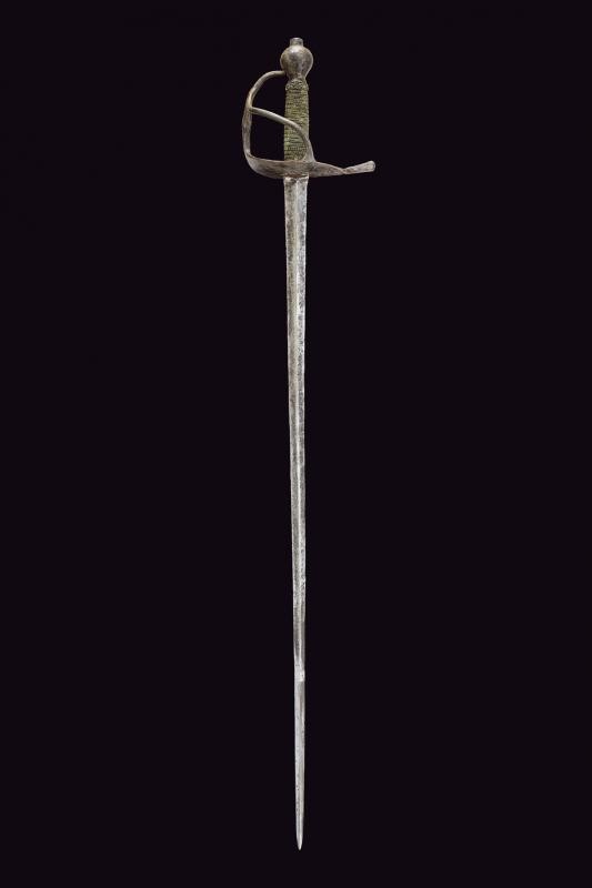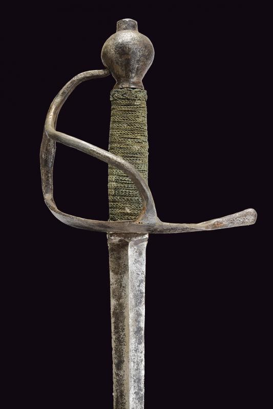 Lama dritta a due fili di sezione a losanga, tallone. Fornimento in ferro con grande coccia marcata "M" e con un'altra marcatura poco leggibile; corto braccio di parata, due rami di guardia. Pomo a vaso. Impugnatura rivestita con trecciola e teste di moro in filo di ottone. Questo lotto è importato da un Paese extra UE e comporta una tassazione aggiuntiva rispetto alla commissione della casa d'aste e alla tassa sul servizio. Di conseguenza, la commissione totale, comprensiva di tutte le tasse, ammonta al 35%.