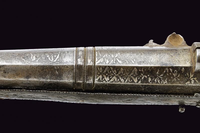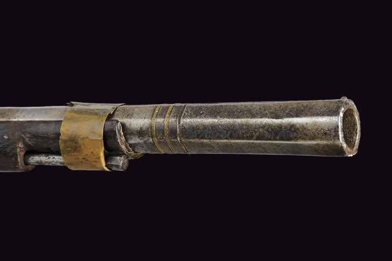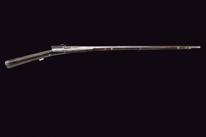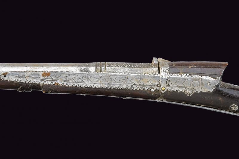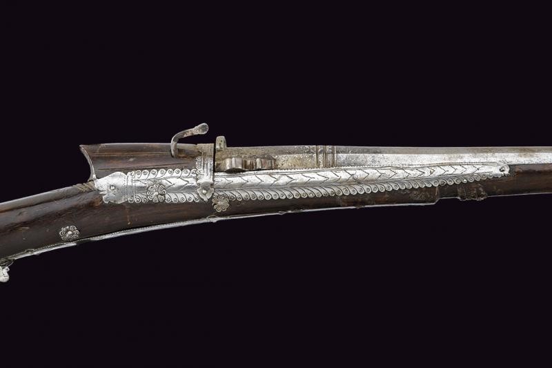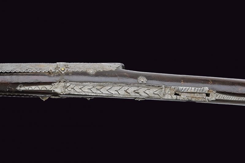 Lunga canna liscia, ottagonale; la base con alzo, scodellino e resti di decorazioni floreali in argento; di sezione decrescente verso la volata, questa decorata con anelli in ottone e munita dei mirino; cal. 15 mm. Cassa intera in legno (rottura sotto la canna) con fornimenti in ferro intagliato ed inciso. Bacchetta in ferro. Piccole mancanze e difetti. Le fascette probabilmente di restauro. Questo lotto è importato da un Paese extra UE e comporta una tassazione aggiuntiva rispetto alla commissione della casa d'aste e alla tassa sul servizio. Di conseguenza, la commissione totale, comprensiva di tutte le tasse, ammonta al 35%.