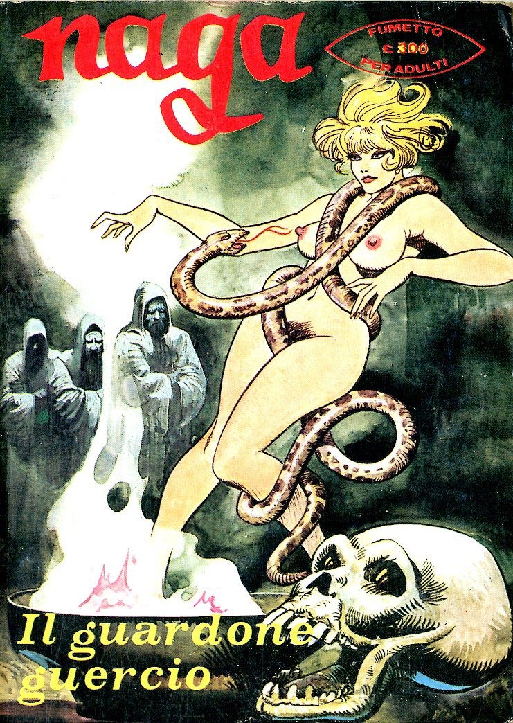 Originale di copertina realizzato da Frollo per "Il guardone guercio", edito su Naga n. 10 dalla Edifumetto nel 1976. Rara e superba copertina di questa storica serie in cui Frollo si alternò con Biffignandi nella realizzazione delle cover, una delle 3 copertine con colorazione diretta realizzate dal maestro veneziano mai apparse sul mercato. La duchessa Natascia Romanoff, figlia dello zar Nicola II di Russia, sfuggita alla morte durante il massacro della sua famiglia a Ekaterinburg grazie a un trucco magico insegnatole da Rasputin, decide di cambiare il suo nome di battesimo in "Naga" e scoprire il mondo del dopoguerra. Vive con il suo servo e amante, Yul, con cui condivide le sue avventure. Lieve piega all'angolo superiore destro.