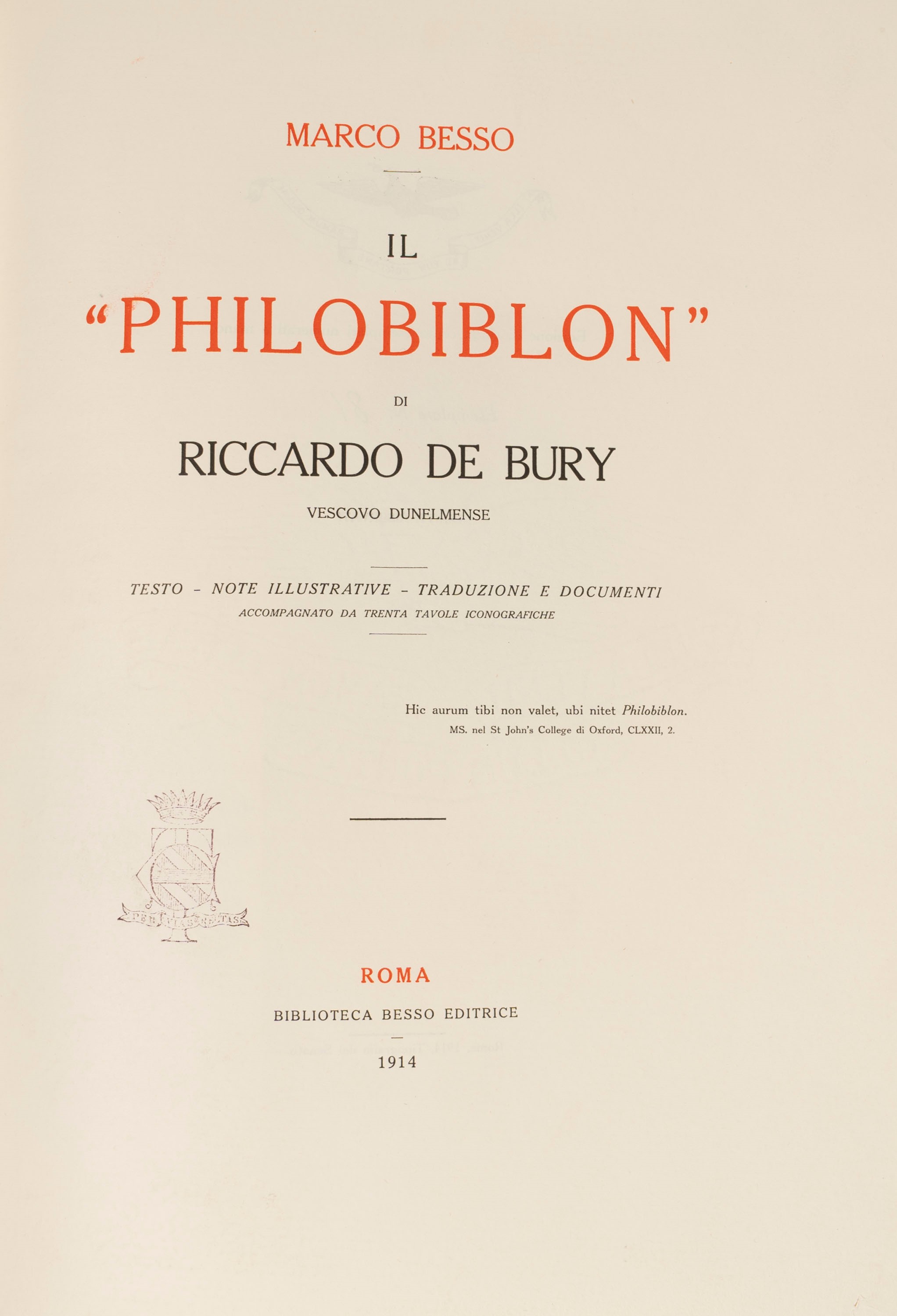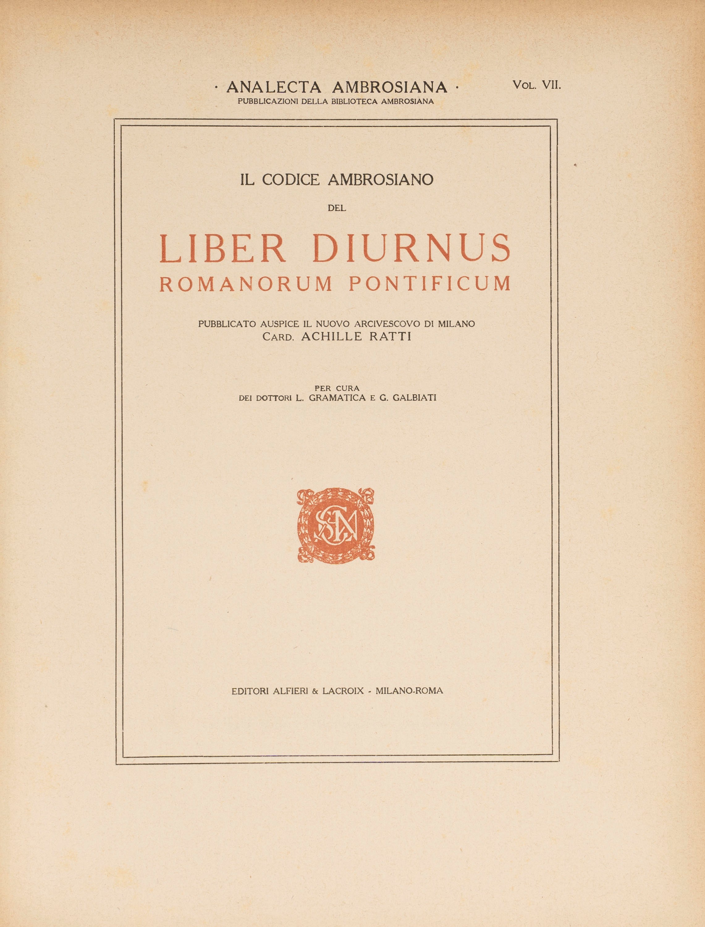 Graz, Akademische Druck, 1970. In 4°. Testo in tedesco e riproduzione in facsimile b/n nel manoscritto, legatura in mezza pelle con autore impresso al piatto.§ Il Codice Ambrosiano del Liber Diurnus Romanorum Pontificum, Roma, Alfieri & Lacroix, 1921. In 4°. Con la riproduzione del famoso codice in color seppia, leggera brunitura, copertina editoriale stampata in rosso e nero. Ex libris cartaceo al contropiatto. Esemplare 129/300. § Besso, Marco, Il "Philobiblon" di Riccardo De Bury Vescovo dunelmense, Roma, Biblioteca Besso, 1914. In 4°. Antiporta incisa, frontespizio in rosso e nero, con XXX tavole riprodotte nel testo, legatura in cartoncino. Esemplare 81/500. Timbro di appartenenza al frontespizio. § Galbiati, Giovanni; Noja, Sergio. Precetti e canoni giuridico morali per arabi cristiani. Volume primo. Il Manoscritto Ambrosiano e la versione italiana, Milano, Hoepli, 1964. § Vitae Aesopi versio rossica, Praga, Sumptibus Pragopress, 1968. In 2°. Con 16 tavole di riproduzioni xilografiche, brochure in ceco e inglese, cartella in carta marmorizzata. § La vita di Gesù Cristo miniata da Nicola Glockendon, Modena, Umberto Orlandini, 1924. In 8°. Con XLVIII tavole in bianco e nero che riproducono le miniature, legatura editoriale con titoli e fregi impressi al piatto.