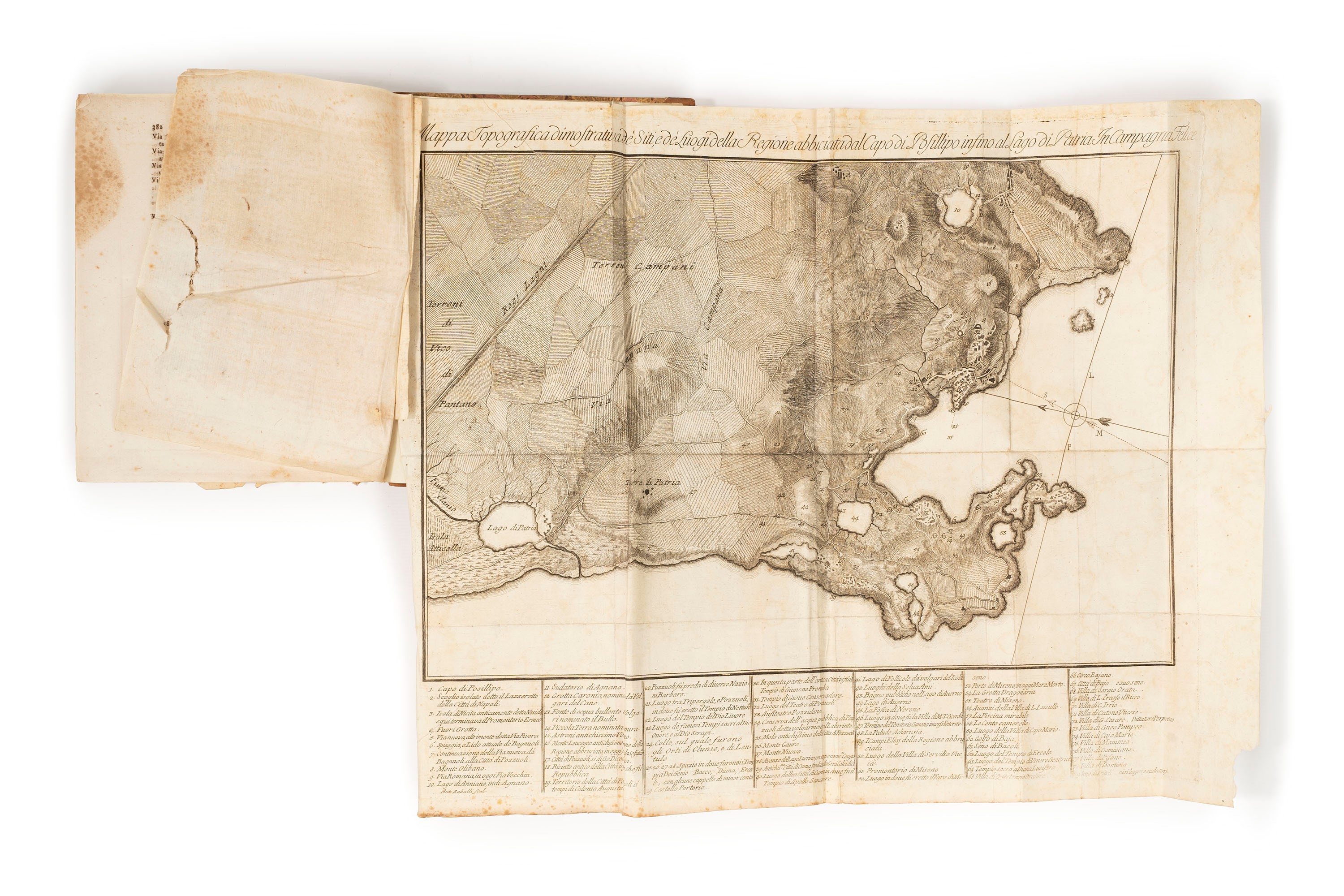 Napoli, Stamperia Raimondiana, 1787. In 4°. Grande tavola ripiegata incisa in rame, intitolata Mappa topografica dal Capo di Posilipo infino al lago Patria in Campagna Felice. arrossature e bruniture, legatura in mezzo vitello con al dorso in marocchino rosso con titolo in oro, piccoli difetti. Exlibris Franciscsci de forlì et duces comitis policastro.