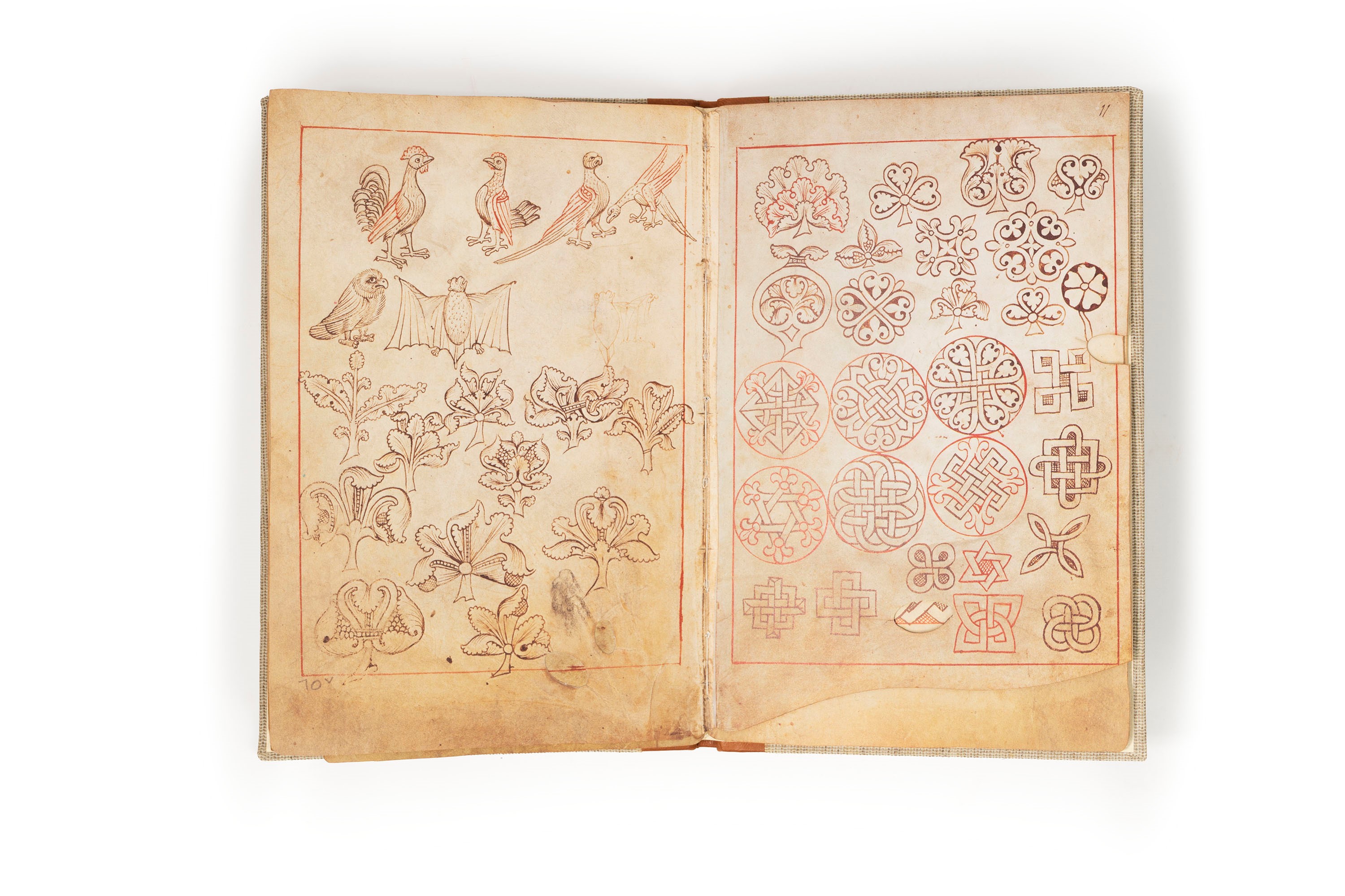 Riproduzione del cosiddetto "Campionario di Reiner", un codice costituito di 13 pagine dove sono raccolti disegni di animali, lettere dell'alfabeto, pattern, figure geometriche. Proveniente dal monastero cistercense di Rein vicino a Graz neel sec. XIII, è probabilmente uno dei più antichi campionari destinati all'insegnamento sopravvissuti.
