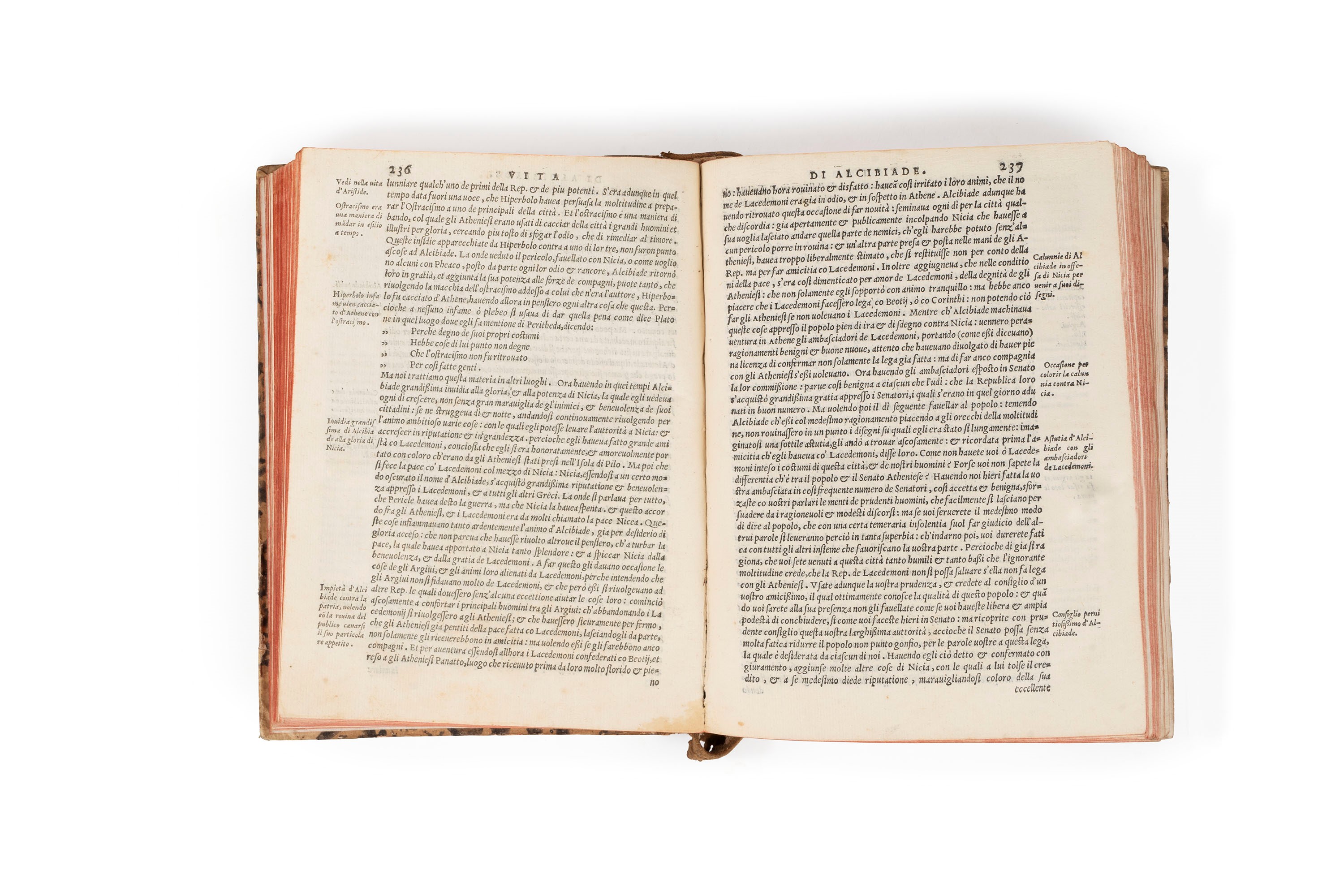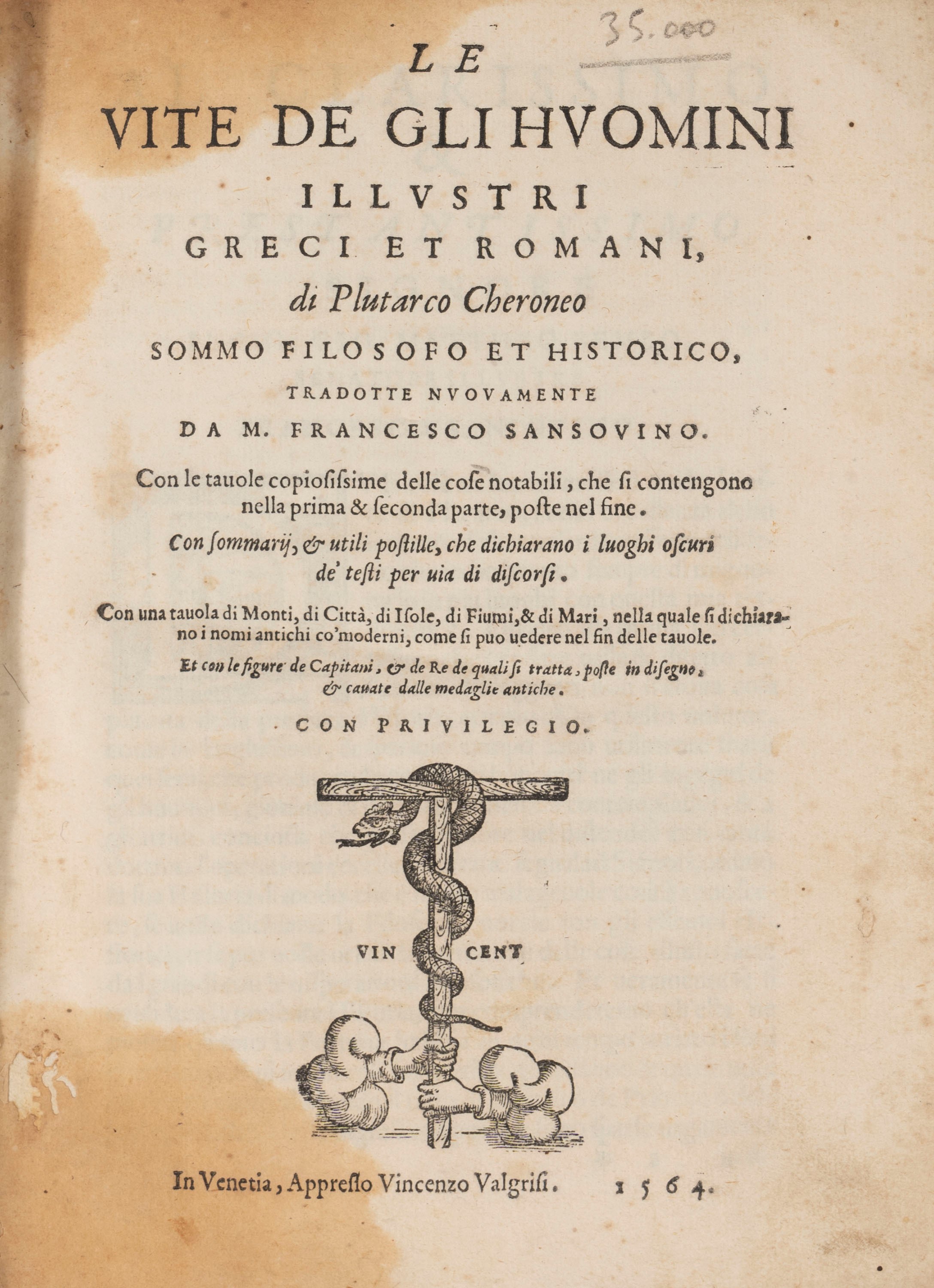 Venezia, Valgrisi, 1564. In 4°. (solo primo volume). Fregio al frontespizio, lavoro di tarlo al margine interno delle prime carte, restaurato al frontespizio, qualche arrossatura, leggero difetto alla cerniera interna, legatura coeva in mezza pelle e carta marmorizzata, fori di tarlo, piccole mancanze, tassello cartaceo al piatto.  § Insieme nel lotto Le vite dei filosofi moralissime estratte da Laertio, Venezia, li Prodotti, 1696 e Plinio Cecilio Secondo, Panegirico, Venezia, Zatta, 1760.