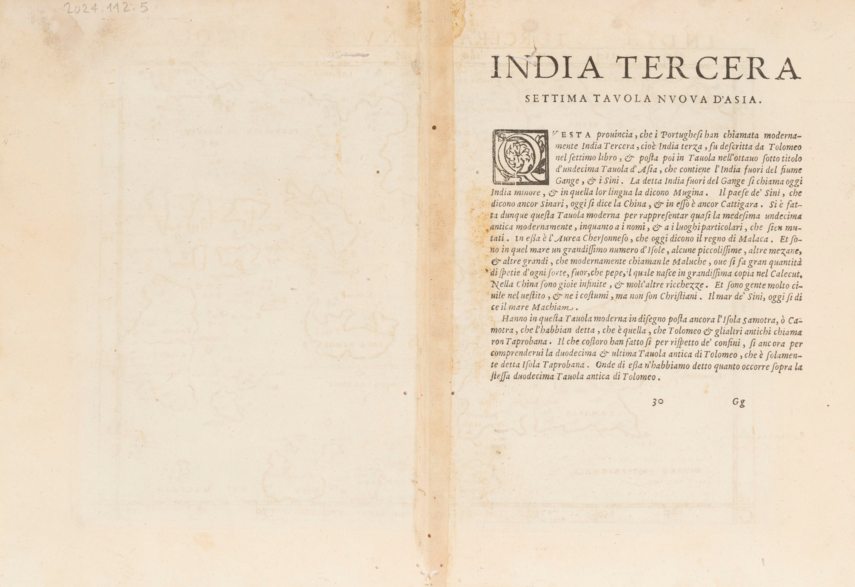 Venezia, 1561. Incisione su rame tratta da "La geografia di Claudio Tolomeo Alessandrino nuovamente tradotta dal greco in italiano da Ieronimo Ruscelli”. Misura cm. 26,5 x 19,1 più margini. Testo italiano al verso. Qualche foro di tarlo.