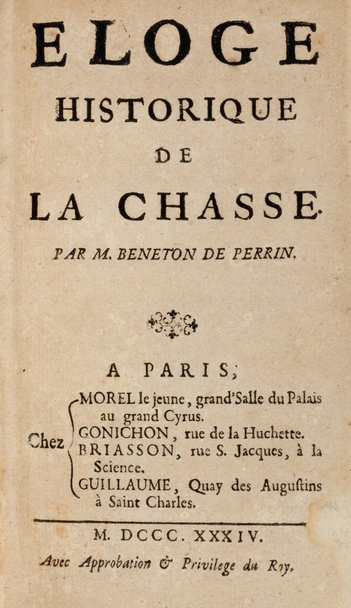 Prima edizione di questo trattato sulla storia della caccia dall'antichità legato con una interessante opera sull'effetto farfalla che episodi insignificanti esercitano sul corso della storia.