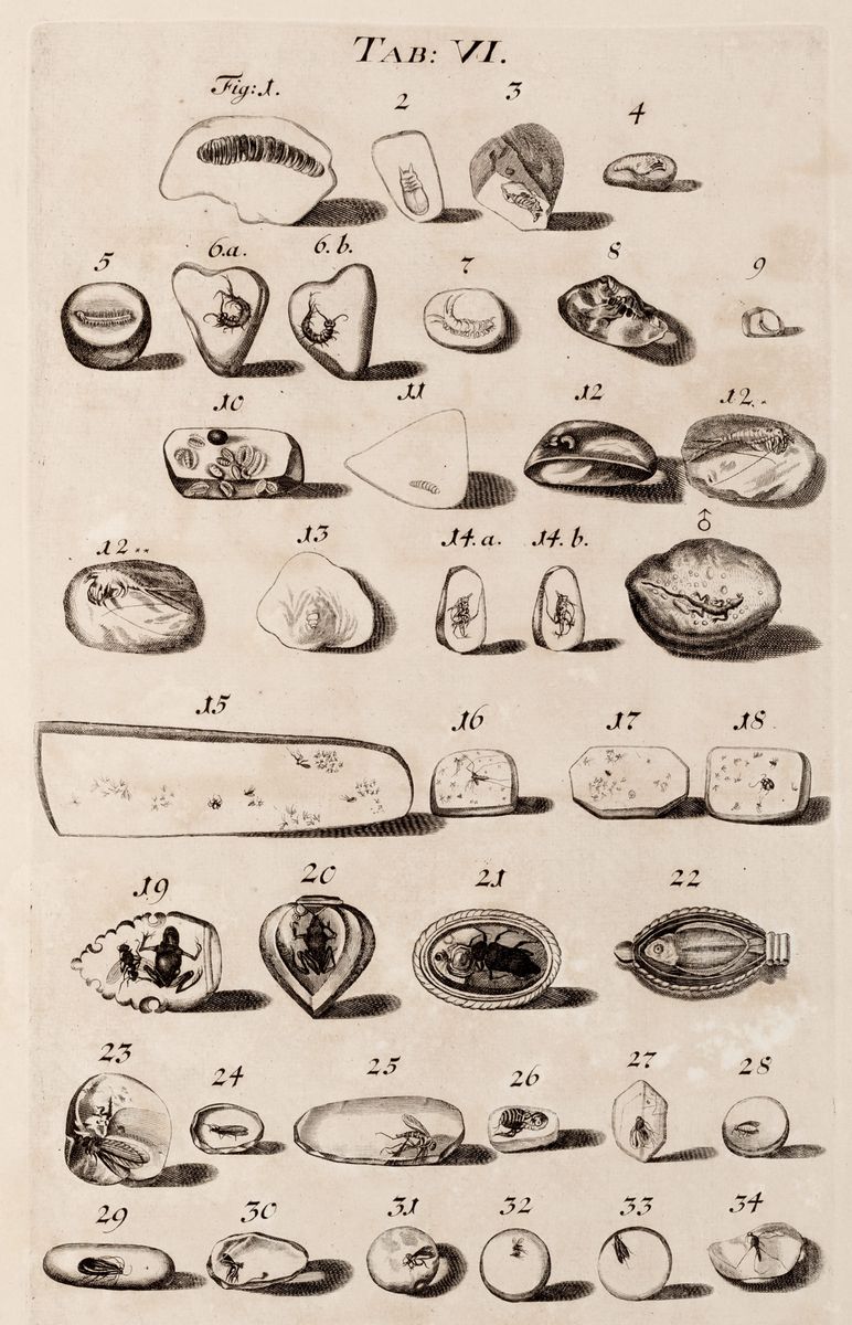 Prima edizione. Molto probabilmente la prima raccolta scientifica della collezione reale di storia naturale di Dresda. Nato a Elbing sulla costa del Mar Baltico, oltre alla professione di medico, Sendel (1686 - 1757) si è dedicato con passione alla raccolta e allo studio dell'ambra baltica. Questo trattato descrive diffusamente le inclusioni organiche osservate nell'ambra ed è accompagnato da 13 splendide tavole di animali e piante incluse nell'ambra che mostrano centinaia di esemplari, dando grande impulso alla ricerca paleobiologica. Sebbene la sua concezione sulla genesi della resina fossile sia ormai superata, Sendel è considerato uno straordinario pioniere della ricerca sull'ambra.