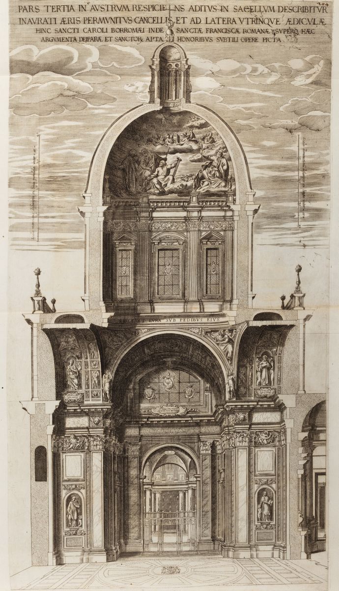Roma, Bartolomeo Zanetti, 1621. In 2°. Con 16 (di 17) carte di tavole ripiegate incise in rame fuori testo e numerose incisioni in rame a piena pagina nel testo, frontespizio calcografico entro struttura architettonica con quadri e didascalie riguardanti la storia della Basilica, iniziali e fregi xilografici, lievi fioriture, qualche carta leggermente brunita, piccolo lavoro di tarlo ai margini, tav. di pag. 65 parzialmente staccata, mancante la carta a1 in fine al volume, rinforzo a una tavola, legatura in pergamena, dorso e cerniere mancanti, aloni, difetti. Timbro di appartenenza alla carta di guardia, firma di appartenenza al frontespizio.