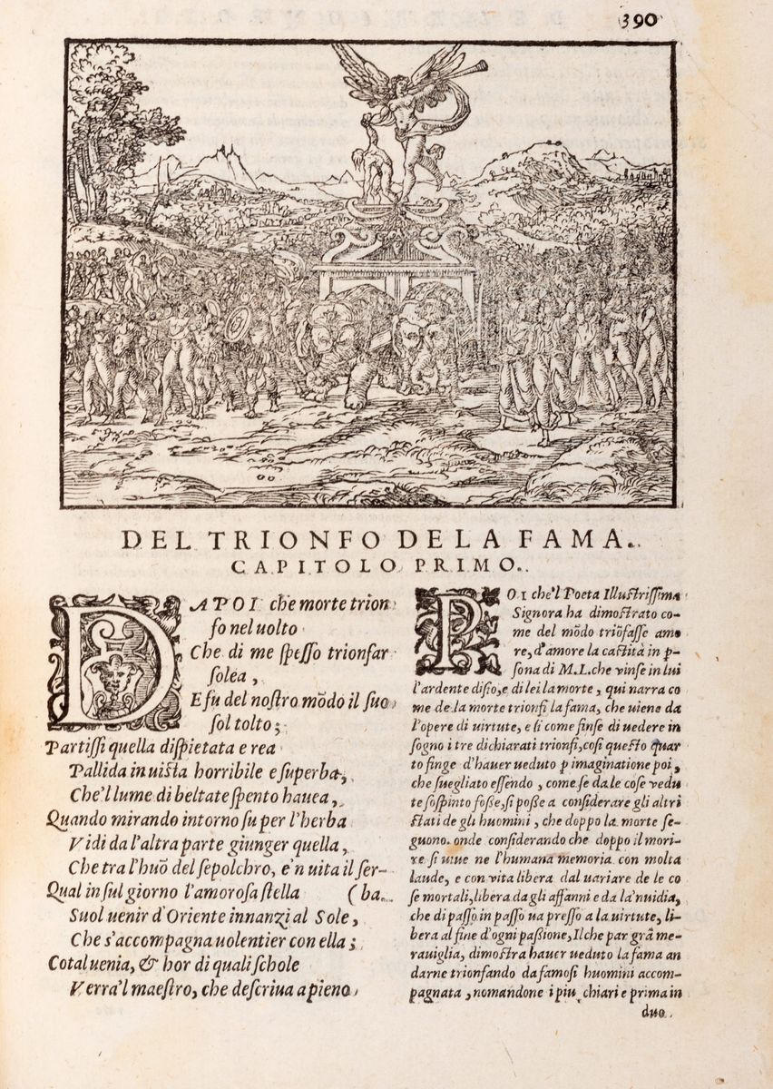 Venezia, Alessandro Griffio, 1581 [ma 1582]. In 8°. Frontespizio inquadrato da cornice e con vignetta incisa in legno di donna alata su un globo suona la tromba e motto "Io volo al ciel per riposarmi in Dio", ritratto di Petrarca e Laura al verso di *4, vignette incise in legno a principio di ciascun Trionfo, iniziali ornate e fregi xilografici, lievi aloni marginali, fioriture sparse, alcune carte leggermente brunite, foro di tarlo all'angolo inferiore esterno, legatura coeva in pergamena con autore e titolo manoscritti al dorso, lievi difetti. Timbro e firme di appartenenza al frontespizio