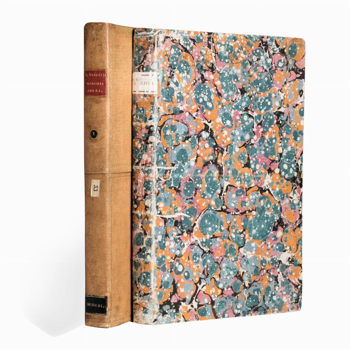 Uno degli indiscussi capolavori bodoniani, universalmente ammirato, che suscitò l'invidioso stupore del Didot. Contiene le Bucoliche, le Georgiche, l'Eneide, i Poemata quae sub Virgilii nomine circumferuntur, la vita di Virgilio di Donato. Esemplare in condizioni genuine, tanto nella legatura, conservata nei suoi astucci originali, quanto nelle condizioni interne. Lommen, The book of books, Londra, 2012: "Monumental edition [...] The typographic design of Bodoni's Virgil is one of the highlights of neoclassicism: the layout is geometric and the letters seem to swim in a sea of white. The printing is perfect in all technical aspects". Brooks 486; De Lama II, 81; Giani, Catalogo, pp.45-46: "Stupenda edizione". Opera, 1793