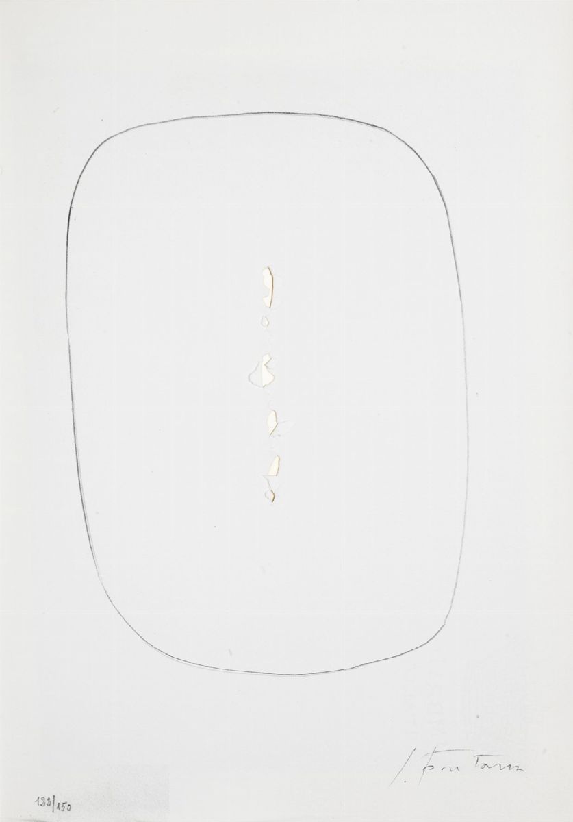 Ancona, B.Bucciarelli, 1965. In 2°. Con 2 CONCETTI SPAZIALI numerati a matita a sinistra e firmati a destra dall'artista, c.ca mm. 358 x 255, brossura editoriale in cartoncino floscio con titolo in nero, astuccio in cartonato con tassello cartaceo ai piatti con autore, titolo ed editore, leggera brunitura al dorso della brossura ed ai margini dell'astuccio.