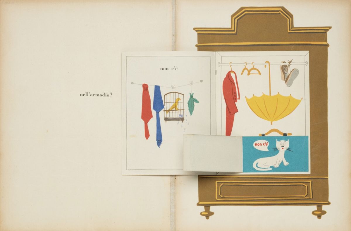 Libro animato dell'artista, il n.7 (di 10). Munari stesso riferì le circostanze della creazione di questi volumi: "Nel 1945, mio figlio aveva 5 anni e io volevo comprargli qualche libro. Ma non trovavo niente che, secondo me, fosse giusto per un bambino di 5 anni. Perche(...) gli editori stampano libri per bambini pensando che non sono i bambini a comprarli, ma gli adulti. (...) Ho cominciato poi a ideare delle storie molto elementari e ho fatto addirittura - dato che sono anche un grafico - dei menabo, cioe dei bozzetti di libri. Li facevo vedere a mio figlio, il quale era il mio verificatore, perche volevo controllare che la cosa funzionasse. Non volevo fare un libro falso. (...) Poi ho pensato a quello che avevo fatto per mio figlio, poteva essere interessante continuarlo per altri bambini. " Maffei 2002, p. 66. gigi cerca il suo berretto. Dove mai l’ avra’ cacciato?, 1945
