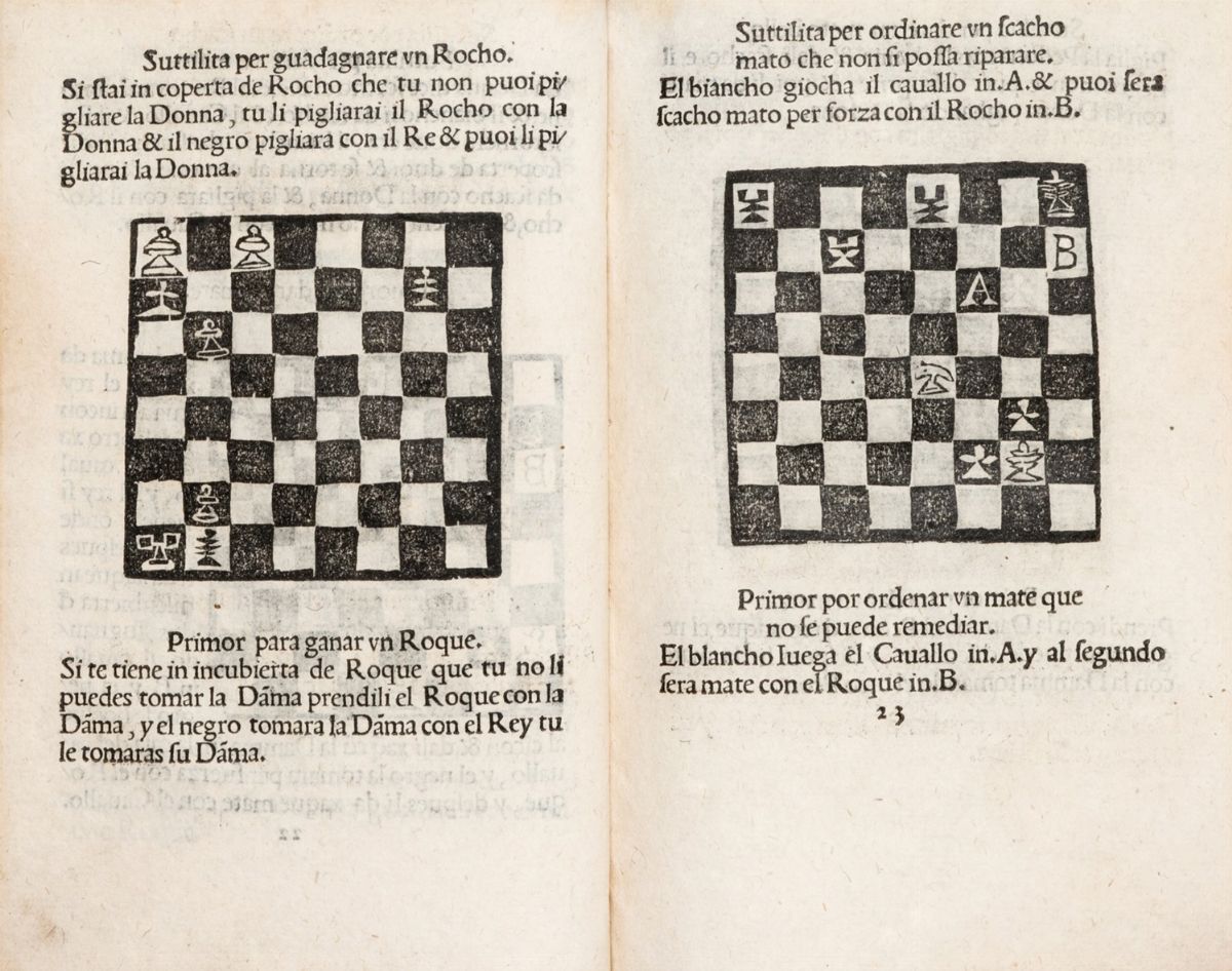 Il manuale basilare del Gioco degli scacchi, sino all'avvento di Ruy Lopez. Nato in Portogallo da una famiglia di origini ebraiche,Pedro Damiano fu farmacista di professione. In seguito al decreto di espulsione degli ebrei dal suo paese emanato nel dicembre del 1496 dal sovrano Manuele I, fuggì in Italia e qui cambiò il suo nome nella versione italiana con cui è noto in tutto il mondo. In Italia Damiano scrisse il suo celeberrimo manuale Libro da imparare giocare a scachi et de li partiti, che fu edito a Roma, in italiano, nel 1512. Il testo conobbe otto edizioni nel XVI secolo. Dedicò il libro a un gentiluomo esperto nell'arte militare, l'eccellentissimo signor Giovanni Giorgio Cesarino Romano. Damiano descrive le regole del gioco, all'epoca già simili, ma non identiche a quelle attuali (mancavano ad esempio arrocco e presa en passant), offre consigli sulla strategia, presenta una selezione di problemi di scacchi (i "partiti" citati nel titolo) tuttora molto famosi (vedi diagrammi) ed analizza alcune aperture. La sua teoria delle aperture fungerà in seguito da base per le rielaborazioni successive, segnatamente quelle operate dall'altro grande teorico iberico del XVI secolo, monsignor Ruy López de Segura. Si tratta della IV edizione di questa celebre operetta, la prima senza note tipografiche, impressa per la prima volta a Roma da Ercole Nani nel 1512, quindi ristampata nel 1518 sempre a Roma da Giovanni Filippo Nani e nel 1524 da Antonio Blado. Datata da Sander 2295 "dopo il 1524" per via del legno al titolo, che presenta uno stato di usura successivo a quello dell'ed. Blado del 1524. Edit 16: CNCE 15916 e 75900; Van der Linde I, 341; Sander 2294 & 2295. Ritirato il 07/02/2017 Libro da imparare giochare a scachi, et de belissimi partiti, reuisti & recoretti, & con summa diligentia da molti famosissimi giocatori emendati, 1524