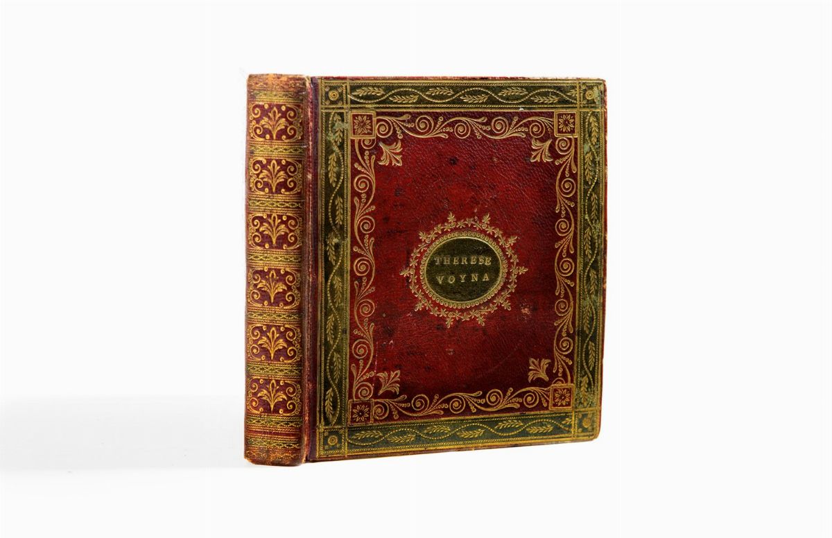 Album della fine del sec. XVIII - inizi sec. XIX, mm. 105 x 95, composto di 70 carte, molte pagine vergate da mani diverse in inchiostro nero con componimenti lirici alternati da 22 illustrazioni a piena pagina eseguite perlopiù a matita, china ed acquerello, alcune delle quali firmate e con dediche, in alcuni casi si tratta solo di schizzi a matita, diverse pagine bianche, elegante legatura coeva in marocchino rosso firmata Georg Friedrich Krauss (piccolo tassello cartaceo con “G. F. Krauss Relieur à Vienne”), ai piatti bordura in pelle verde e con impressioni in oro, al centro del campo un ovale in pelle verde con al piatto anteriore “THERESE VOYNA” e all’inferiore “VIENNE 1792”, dorso completamente decorato, tagli dorati, sguardie in seta verde con cornice di rotella e greca in oro, lievi difetti.
