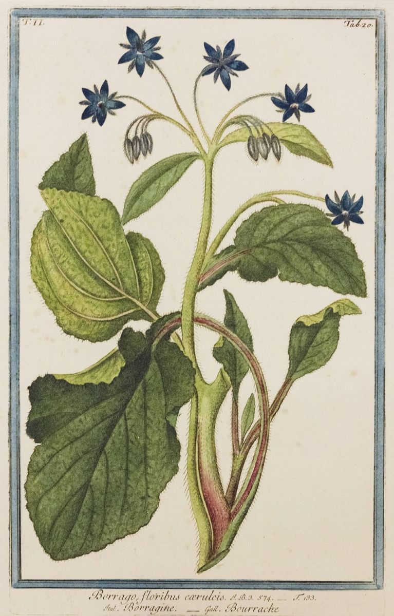 [Regensberg, 1737-1745], gruppo di 4 tavole incise in rame a colori tratte dall'opera Phytanthoza Iconographia, mm 320 x 205 ciascuna. Insieme nel lotto due tavole raffiguranti Borrago, floribus ceruleis e Marrubium album vulgare, incise in rame e colorate a mano, secolo XVIII, mm 363 x 225 ciascuna.