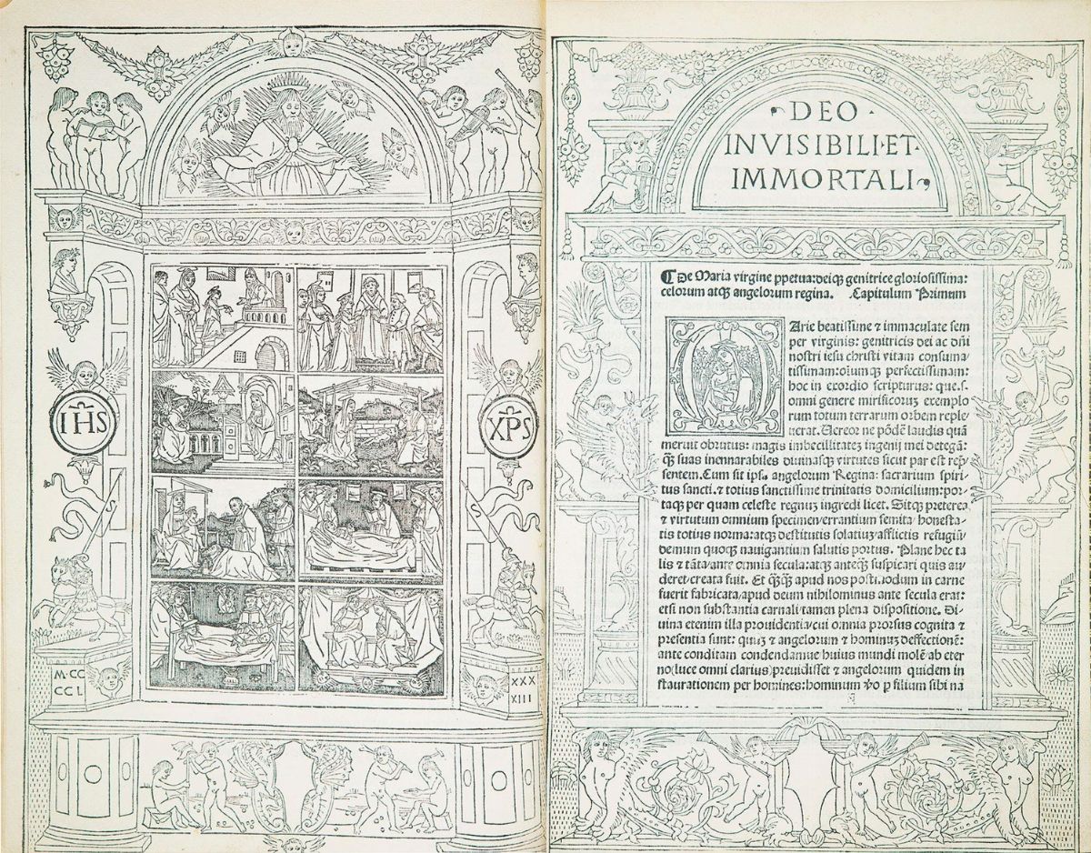 Ferrara, Lorenzo de Rossi, 29 aprile 1497. In 2°. A carta Air titolo xilografico, A1v xilogrphilippus 1497afia con la presentazione del volume da parte dell’autore a Beatrice d’Aragona, dedicataria dell’opera, entro una celebre cornice architettonica siglata "S" nelle due bandiere laterali portate da cavalieri, a1v legno a piena pagina con la stessa bordura a racchiudere 8 scene dalla vita della Vergine, a2r incipit racchiuso entro una nuova bordura architettonica decorata con putti e figure mitologiche, il capilettera iniziale su 8 linee di testo raffigurante la vergine col bambino, 172 ritratti xilografici di donne famose, di cui 116 ripetute, stampate da 52 matrici lignee, marca tipografica al colophon, marginali restauri all’ultima carta, legatura del sec.XX in marocchino purpureo, dorso a sei nervi con decorazioni in oro, tagli dorati. Tassello della Libreria “La Medicea” al contropiatto.