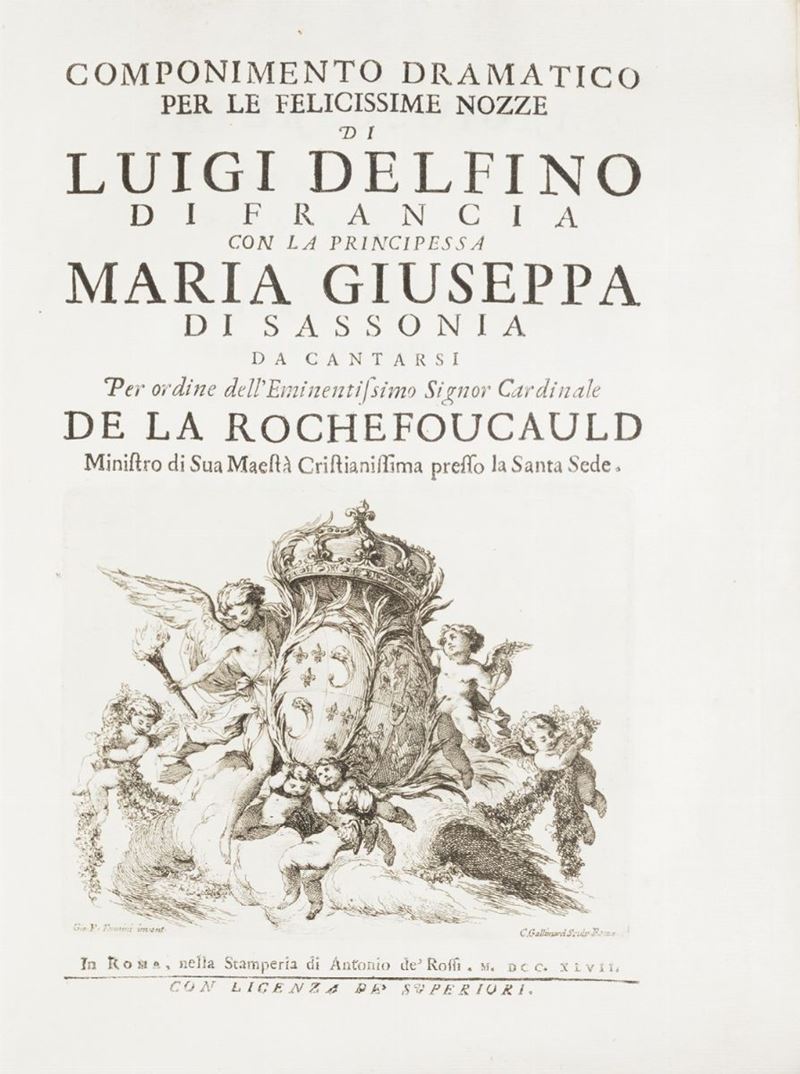 Miscellanea di 26 opere in vari formati. Oltre alle 4 descritte, odi per nozze, diverse azioni drammatiche per il compleanno di Francesco III duca di Modena, cantate per pubbliche celebrazioni nel Collegio Nazareno, nel Collegio Calasanzio e nel Collegio Capranica a Roma, un componimento drammatico per feste celebrate nella città di Veroli in onore di Clemente XIII, e altri, tutto pubblicato nel secolo XVIII. Lotto non passibile di restituzione. Azione drammatica in onore di S.Giovanni Nepomuceno per le felicissime, e gloriose esaltazioni delle nuove cesaree maestà... di Francesco primo eletto imperadore de' romani... di Maria Teresa imperadrice, 1745