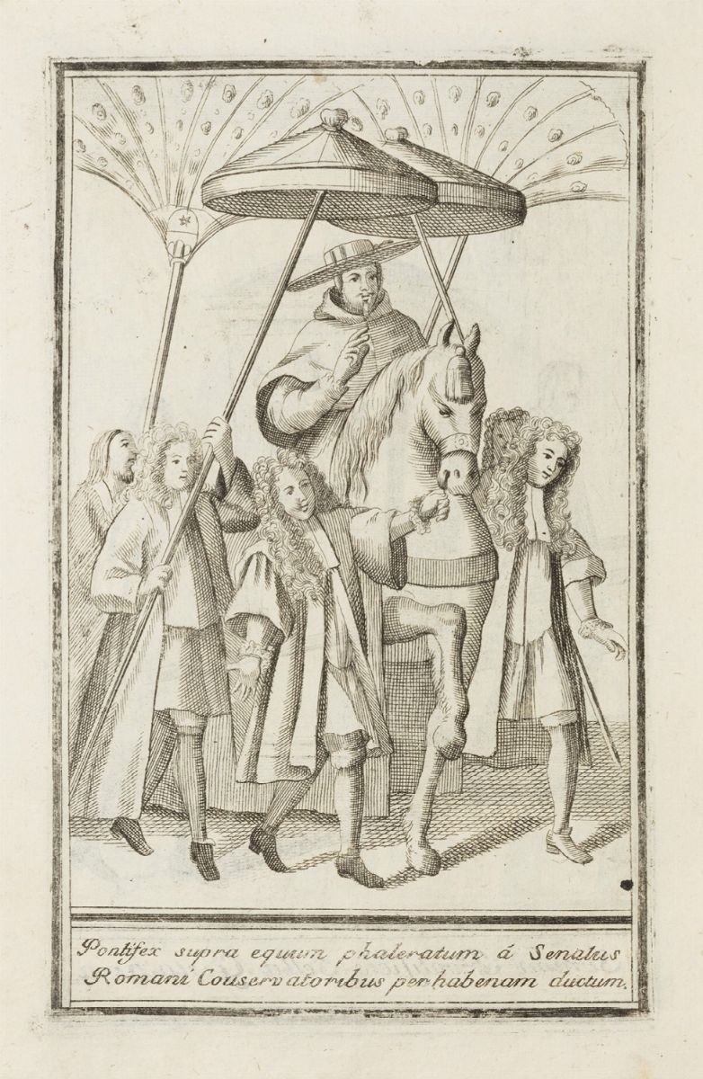 s.l., s.t., 1707. In 4°. 2 parti in 1 vol. Parte prima: frontespizio in latino, tavola figurata, frontespizio in italiano, 1 tavola raffigurante Gesù, ed una con l’emblema degli Argonauti, 207 tavole, di cui 204 incise al recto-verso di 102 carte e 3 tavole al solo recto di 3 carte raffiguranti per la maggior parte gli abiti degli ordini religiosi maschili; seconda parte: antiporta raffigurante un angelo che dispiega la scritta "Monalium Institutio, et Habitus P.", 2 frontespizi in latino ed in italiano, tavola con cartiglio con l'iscrizione "Gli Argonauti", 127 tavole di cui 126 tavole impresse al recto-verso di 63 carte raffiguranti per la maggior parte gli abiti degli ordini religiosi femminili. Legato con Ordinum equestrium ac militarium brevis narratio, cum imaginibus exposita, a P. Coronelli. Quampluribus additionibus locupletatis, nempe Curiae Romanae, Hebraeorum, Graecorumvè, in anterioribus editionibus omissis. | Degli Ordini equestri, e militari, esposti in imagini breve racconto. Venezia, Orlandi, 1715. In 4°. Frontespizio con doppio titolo in latino e italiano, ritratto del Gran Maestro dell’Ordine di Malta Raimondo de Perellos, con 232 tavole, il tutto inciso in rame, qualche leggera gora d'acqua e macchie, la quarta carta con lacune ai margini, alcune tavole con rinforzo al margine interno, legatura del sec. XVIII in mezza pelle, piatti in carta marmorizzata, titolo in oro su tassello al dorso, lievi difetti. Ex libris «Valperga di Masino» incollato al contropiatto.