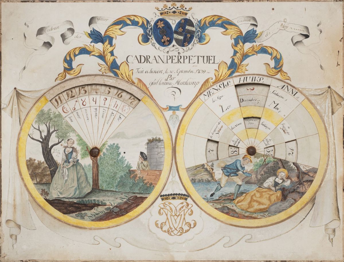 Calendario su carta, datato 30 settembre 1739, 400x510 mm, composto da un foglio suddiviso in 2 quadranti, uno per i giorni e i pianeti (Cadran des yours), l'altro per i mesi e i segni zodiacali (Cadran des Moy) decorati con scene di genere, colorato a mano con acquerello e tempera, incollato su cartone e ritagliato; dietro i quadranti sono applicate mediante un fermaglio in metallo due volvelle cartacee con i giorni, i mesi e segni zodiacali, due stemmi sovrastati da corona occupano la parte superiore centrale del foglio, qualche piccola caduta di colore, leggero alone di umidità al margine inferiore, piccoli difetti, in cornice coeva in legno dorato con motivi ornamentali a rilievo, lievi difetti.