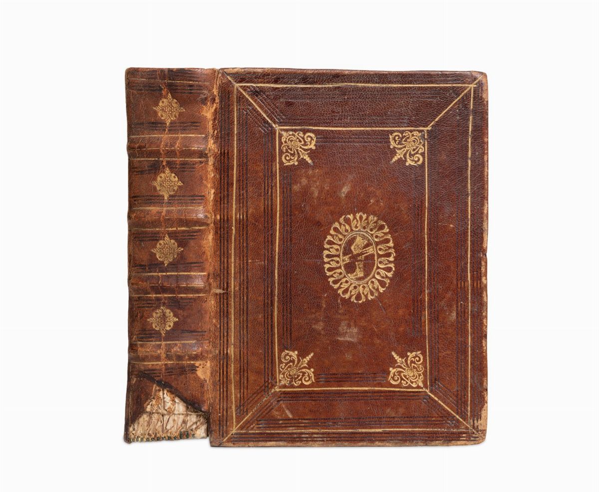Amsterdam, Louis Elzevir, 1644. In 4°. Amsterdam, Lowijs Elzewier, 1644. In 4°. 2 opere in 1 vol. con medesimi dati tipografici. Marca tipografica ad entrambi i frontespizi, capilettera xilografici, numerose illustrazioni xilografiche e diagrammi piena pagina e nel testo, carattere corsivo e romano, primo frontespizio con tracce di sporco, leggere bruniture, arrossature e fioriture, qualche macchia, legatura del sec. XVII in marocchino marrone, ai piatti duplice cornice di filetti impressi a secco ed in oro, al centro del piatto anteriore uno stemma ovale con una gamba interrotta da una banda diagonale, all'inferiore l'iscrizione "ALEX/GAMBALO/NGA/A RIMINEN/IV UTR/D", dorso a 4 nervi, lacuna al dorso, spellature e lievi macchie.