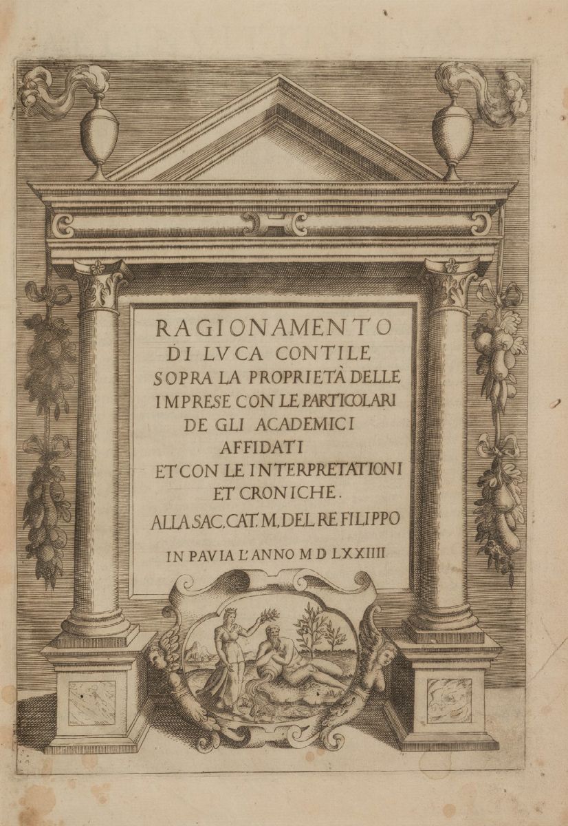 Pavia, Girolamo Bartoli, 1574. In 2°. Frontespizio inciso entro bordura architettonica, arma di Filippo II di Spagna incisa a piena pagina a L4r, insegna dell’Accademia degli Affidati al verso di M2 e 114 imprese dei membri dell’Accademia, mancante l'ultimo fascicolo 2R8, piccolo strappo al margine esterno del frontespizio, bruniture su alcune carte, legatura coeva in pergamena rigida, dorso con lacune.
