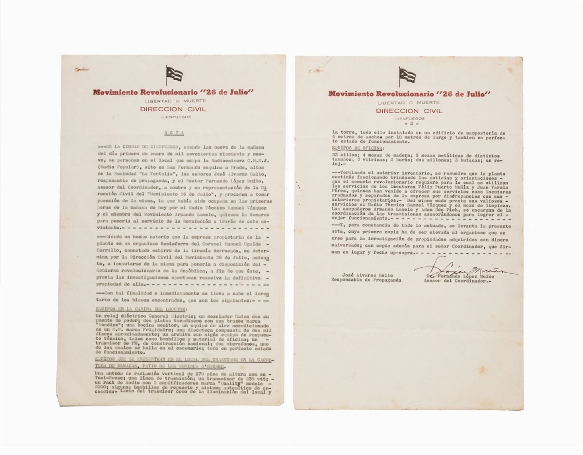 Serie di 50 atti, 74 pagine (325 x 225 mm) su carta con intestazione ufficiale della Direccion Civil di Cienfuegos, Cuba, recante sul frontespizio "Movimento revolucionario 26 de Julio - Libertad o muerte. Cienfuegos" e un documento manoscritto compilato fronte/retro con inchiostro blu e nero (134 x 182 mm).