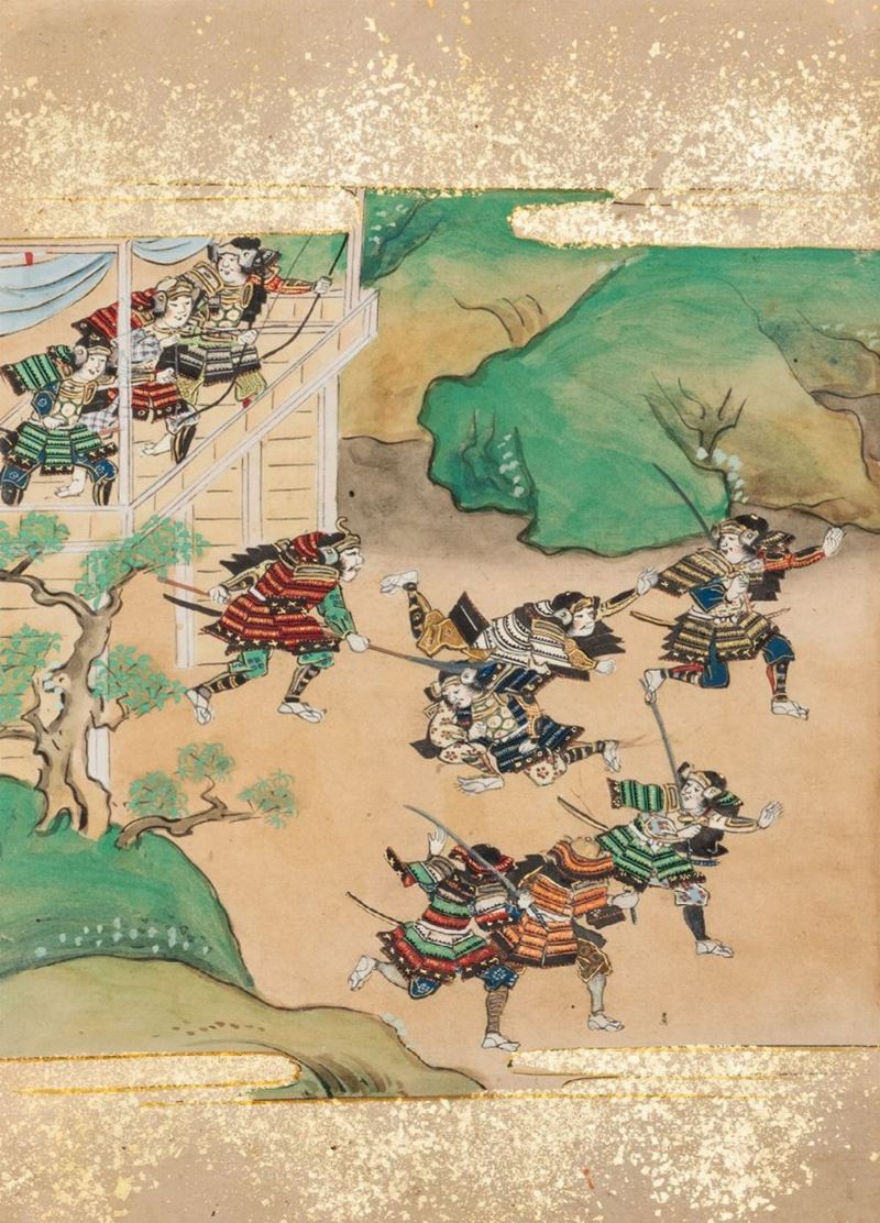 Affascinante insieme di tavole finemente eseguite a tempera ed oro, raffiguranti scene di battaglia con Samurai, scene di vita di corte con governatori di provincia. Senza Titolo, 1868