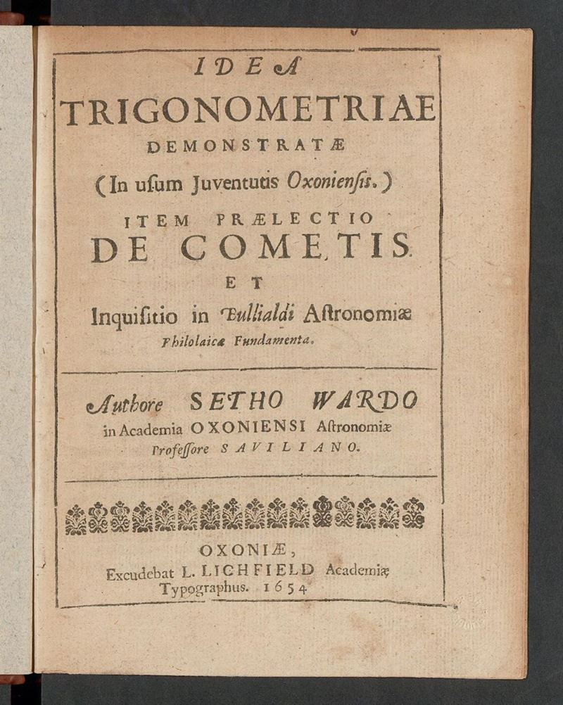 Matematico, astronomo inglese Seth Ward partecipò ai più accesi dibatti scientifici dell'epoca. Idea Trigonometriae Demonstratae...item Praelectio de Cometis et ..., 1654