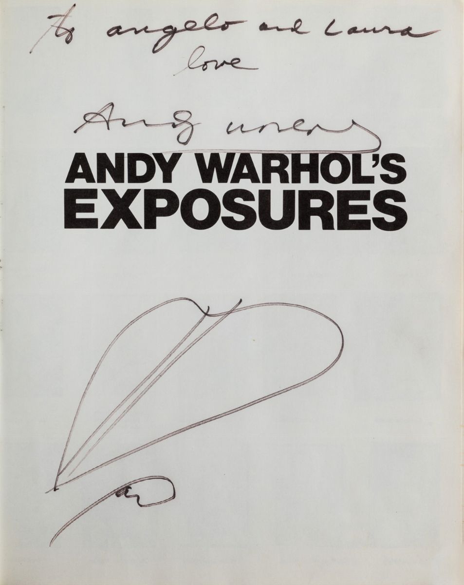 Prima edizione in esemplare arricchito dalla firma di Warhol in pennarello nero al piatto anteriore della sovracoperta, (scolorita), ed all'occhiello un disegno di un cuore stilizzato e dedica autografa firmata dell'artista "to angelo and Laura / love" . Andy Warhol's Exposures, 1979