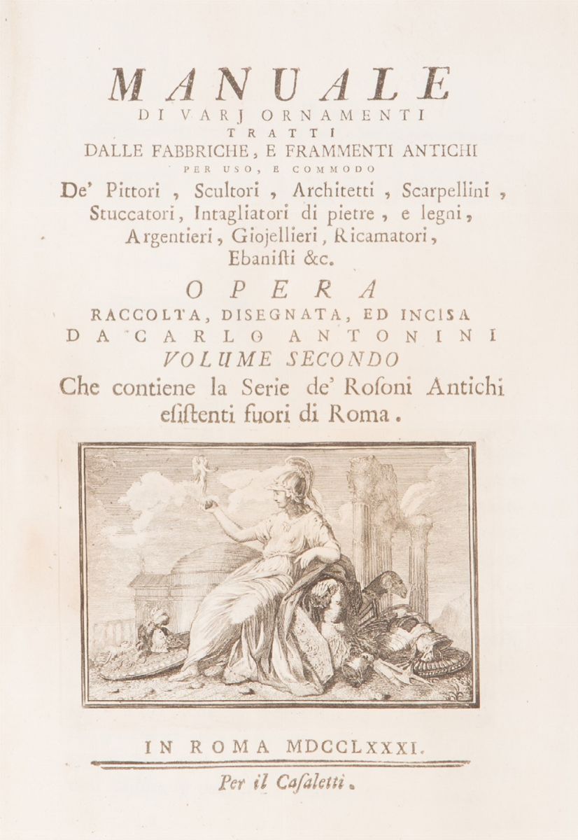 Rossetti 429 e 429 a; Berlin Kat. 594. Cicognara 401: "tavole in rame di bel disegno e buona esecuzione". Copia in discreto stato di conservazione di questo raro manuale dedicato a papa Pio VI (Giannangelo Braschi). Manuale di varj ornamenti tratti dalle fabbriche, e frammenti antichi per uso e commodo de' pittori, scultori, architetti, scarpellini, stuccatori, intagliatori di pietre, e legni, argentieri, giojellieri, ricamatori, ebanisti & c...Volume primo [-secondo], 1777