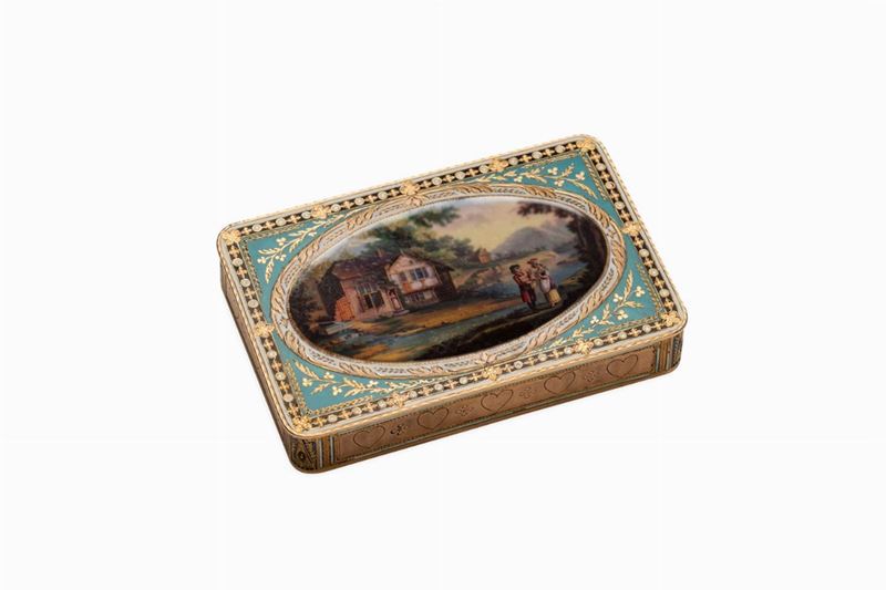 Prezioso cimelio appartenuto ad una delle donne più controverse, amate e discusse del Novecento, di certo una vera protagonista del suo periodo. Edda Mussolini in Ciano ha segnato la vita politica del Ventennio, i fascisti la chiamavano eccellenza, “l'eminenza grigia” del regime, ma Edda Ciano Mussolini, non fu altro che la figlia del Duce. Moglie del ministro degli Esteri Galeazzo Ciano, il delfino di suo padre, resterà a lui legata per la vita. Il 25 luglio 1943, Ciano insieme ad altri gerarchi, aderisce all'ordine del Giorno Grandi che, approvato dal Gran Consiglio del Fascismo, vede la fine di Mussolini, un'azione che gli costerà l'accusa di alto tradimento e che segnerà l'inizio del dramma personale di Edda. Lui morirà a Verona, dopo il celebre processo, in cui venne riconosciuto colpevole (insieme con Marinelli, Gottardi, Pareschi e al vecchio generale Emilio De Bono) di alto tradimento e condannato alla fucilazione, eseguita l'11 gennaio 1944. Ma la vita per Edda continuò, e non fu una vita banale. Dopo i due anni di confino a Lipari, trascorse gran parte della sua vita tra Capri e Roma, dove morì nell'aprile del 1995. Il presente cimelio si lega quasi certamente al periodo caprese, ad una fase della vita di Edda votata alla mondanità. Accanita fumatrice, appassionata giocatrice di carte, proprio a Capri incontrò il secondo grande amore della sua vita: la liason sentimentale con Pietro Capuano, meglio noto come Chantecler "il gioielliere dandy", nacque dopo che la contessa, mentre era confinata a Lipari ricevette una cartolina dell’estroso e stravagante personaggio che recitava “A Capri avete un amico. Firmato Pietro Capuano”. Quando Edda, dopo gli anni dell’esilio, arrivò a Capri, conobbe finalmente Chantecler e la loro relazione prese forma. Pietro Capuano è stato l’uomo più vicino ad Edda fino alla fine dei suoi giorni, quando la Contessa ritornò sull’isola per accompagnarlo alla sua ultima dimora. Questa pregiata tabacchiera fu di sicuro un suo regalo, raffinata ed elegante come lo stile dei suoi gioielli che dal 1947 ha prodotto e commercializzato. Non sappiamo quando venne donato a Edda, di sicuro l'occasione doveva essere importante. La raffinata decorazione a smalti che raffigura una coppia e il campo di cuori rossi che si estende al retro sono chiare allusioni alla loro relazione, espresse nello stile dell'alta gioielleria che da sempre contraddistingue l'arte di Capuano. La scelse con cura, per donarla alla sua Edda, che contraccambiava così: in un messaggio del giugno 1951 scrive «A momenti mi piacerebbe esser sposata con te, possibilmente, o con qualsiasi altro. Per non dovere sempre io combattere». Tabacchiera in oro e smalti, 1950