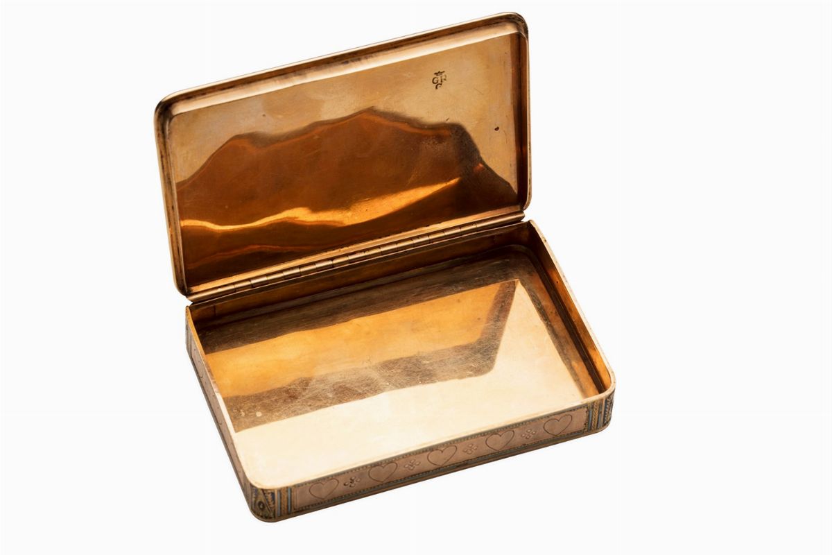 Tabacchiera in oro e smalti fine sec.XIX di forma rettangolare, sul fronte paesaggi con figure, al retro decoro a cuori, smalto policromo, raffinate e delicate incisioni. Peso gr. 94,7. Dimensioni mm. 88 x 57 x 15.