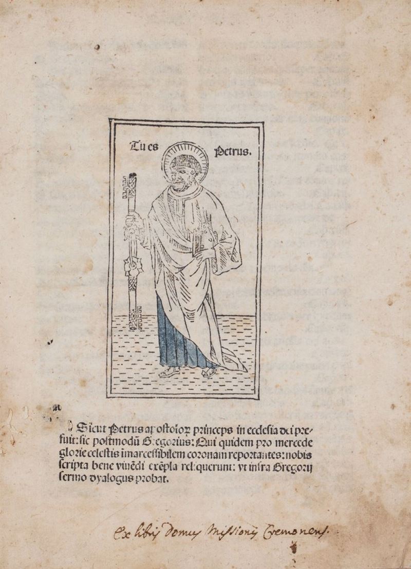 Pregevole edizione, arricchita dal legno raffigurante San Pietro ad apertura testo. I Dialoghi di Gregorio Magno sono dedicati ai miracoli dei santi italiani contemporanei, primo fra i quali san Benedetto da Norcia. Egli mette in scena, con un linguaggio medio comprensibile a tutti, i protagonisti di una Chiesa spirituale vicina al popolo delle campagne. H 7963 & HC 7986. Goff G440 & Goff G405. Dialogorum libri quattuor, 1492