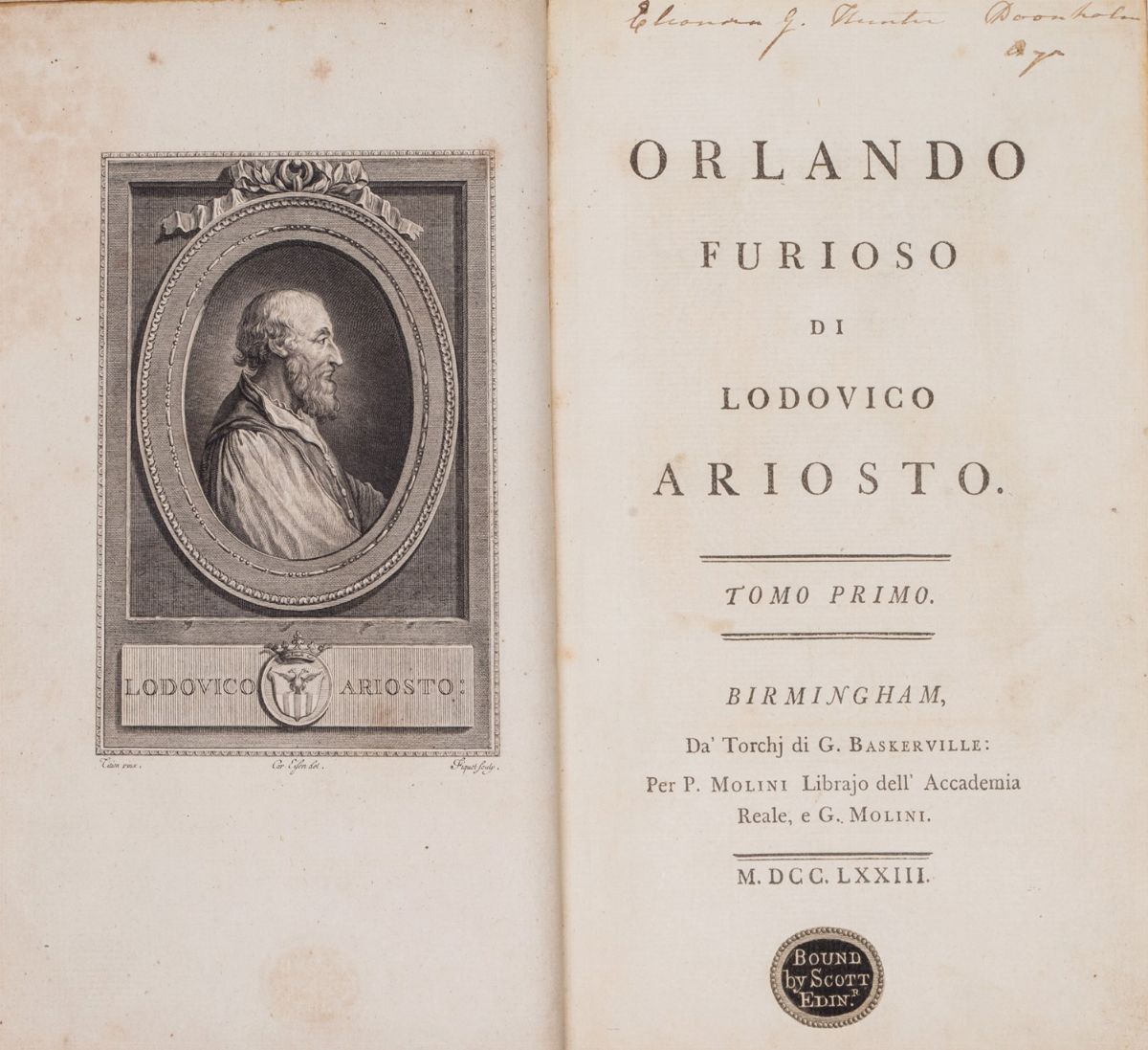 Esemplare dagli ampi margini. Agnelli-Ravegnani p. 204: "magnifica edizione, sia per bellezza di stampa, sia per le illustrazioni, che la fanno uno dei livres à figures meglio riusciti del sec. XVIII". Orlando Furioso, 1773