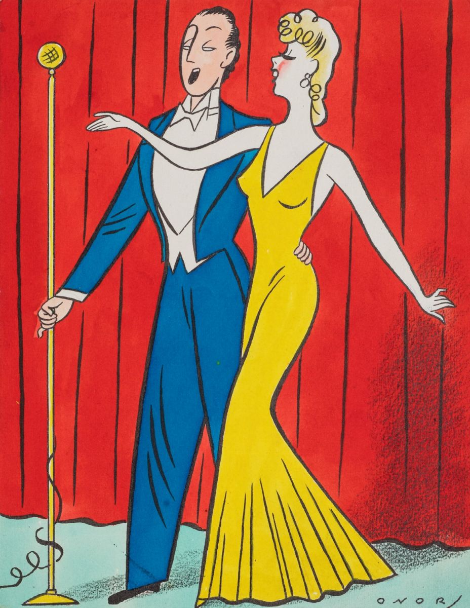 Tavola originale, tecnica mista su cartone, mm. 400 x 300, firmato in basso a sinistra "Onorato, 33". § Nel lotto anche due bozzetti originali su cartone, mm. 235 x 185, che raffigurano una coppia in abito da sera sul palcoscenico ed in incantatore di serpenti, entrambi firmati, in basso a destra.