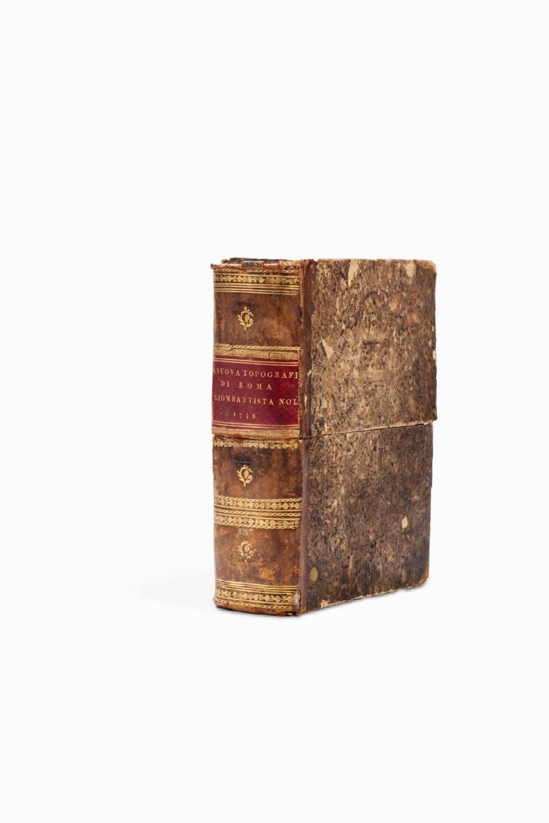 Carta murale non montata, composta di 12 riquadri in tela di c.ca mm. 685 x 430 aperti, su ciascuno sono montate 8 incisioni di c.ca mm. 346 x 430, vignette con figure allegoriche insieme ai monumenti di Roma e la dedica a Papa Benedetto XIV sulla base di una colonna, il tutto in una cornice rococò, i riquadri piegati presentano un tassello cartaceo con l'indicazione manoscritta d'epoca, del rione in esso raffigurato, il tutto conservato in custodia in mezza pelle marrone, con al dorso tassello in marocchino rosso col titolo in oro "La nuova topografia di Roma di Giambattista Nolli, 1748", qualche mancanza". Timbro dell'epoca con iniziali.